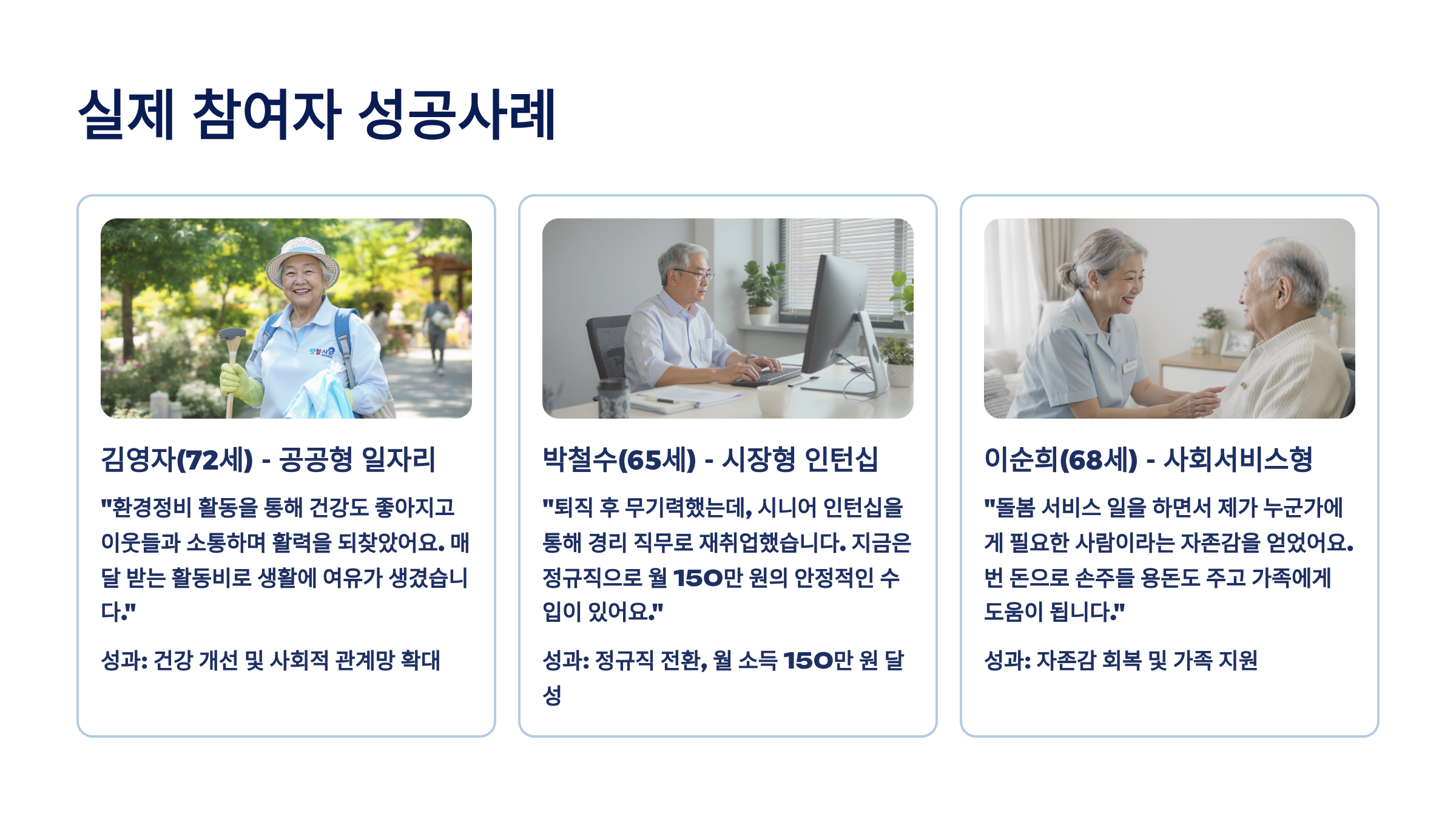 노인일자리 사업에 참여해서 인생 2막을 성공적으로 열어가신 분들의 이야기를 들려드릴게요! 이분들의 경험이 여러분께도 용기와 희망이 되었으면 좋겠어요. 실제 사례를 통해 어떤 변화가 가능한지 확인해보세요! 🌟