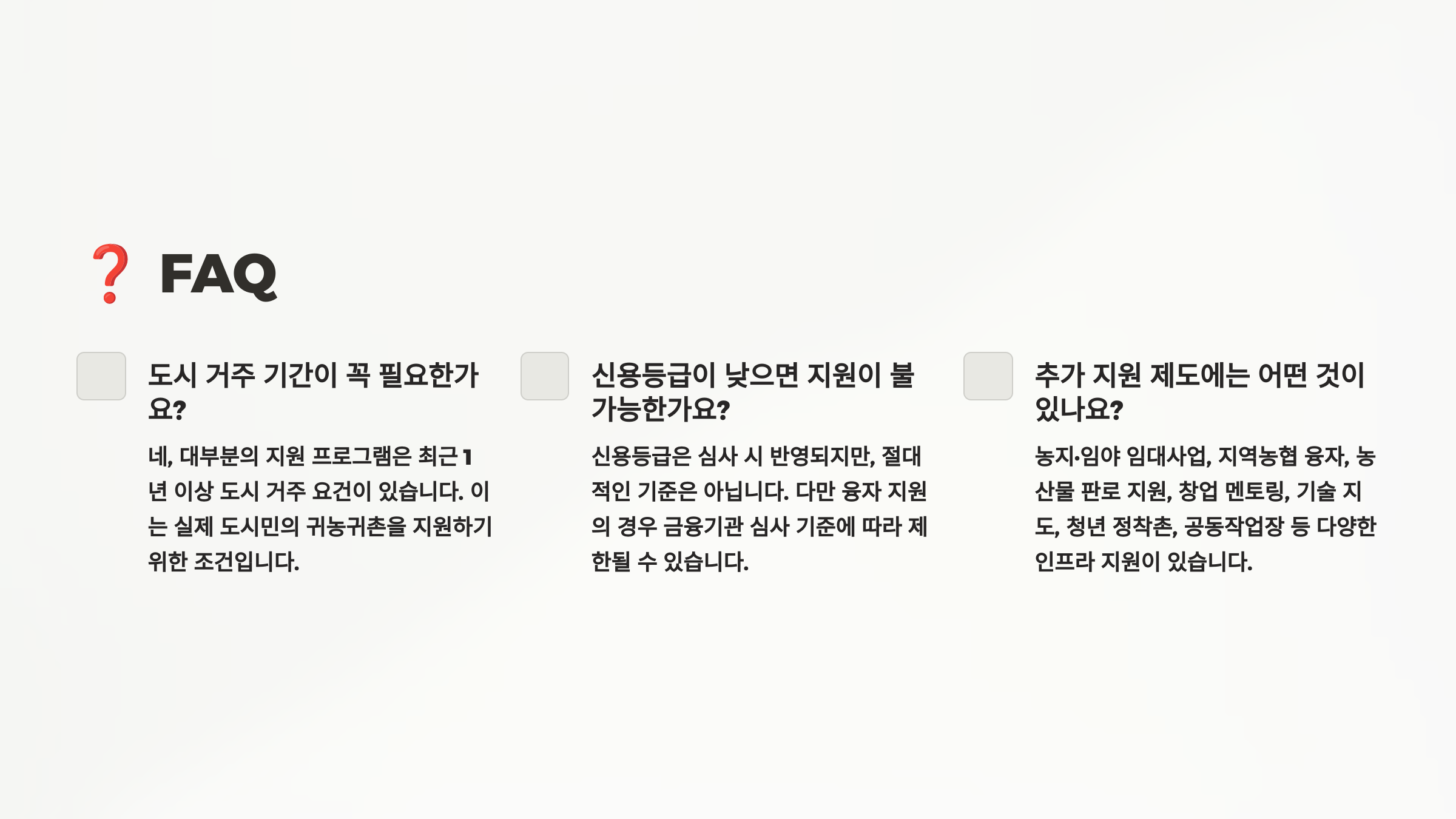 A7. 의무 거주 기간(보통 5년) 내에 도시로 이주하면 지원금을 환수 조치해요. 부득이한 사유가 있다면 사전에 신고하고 상담받으세요.
