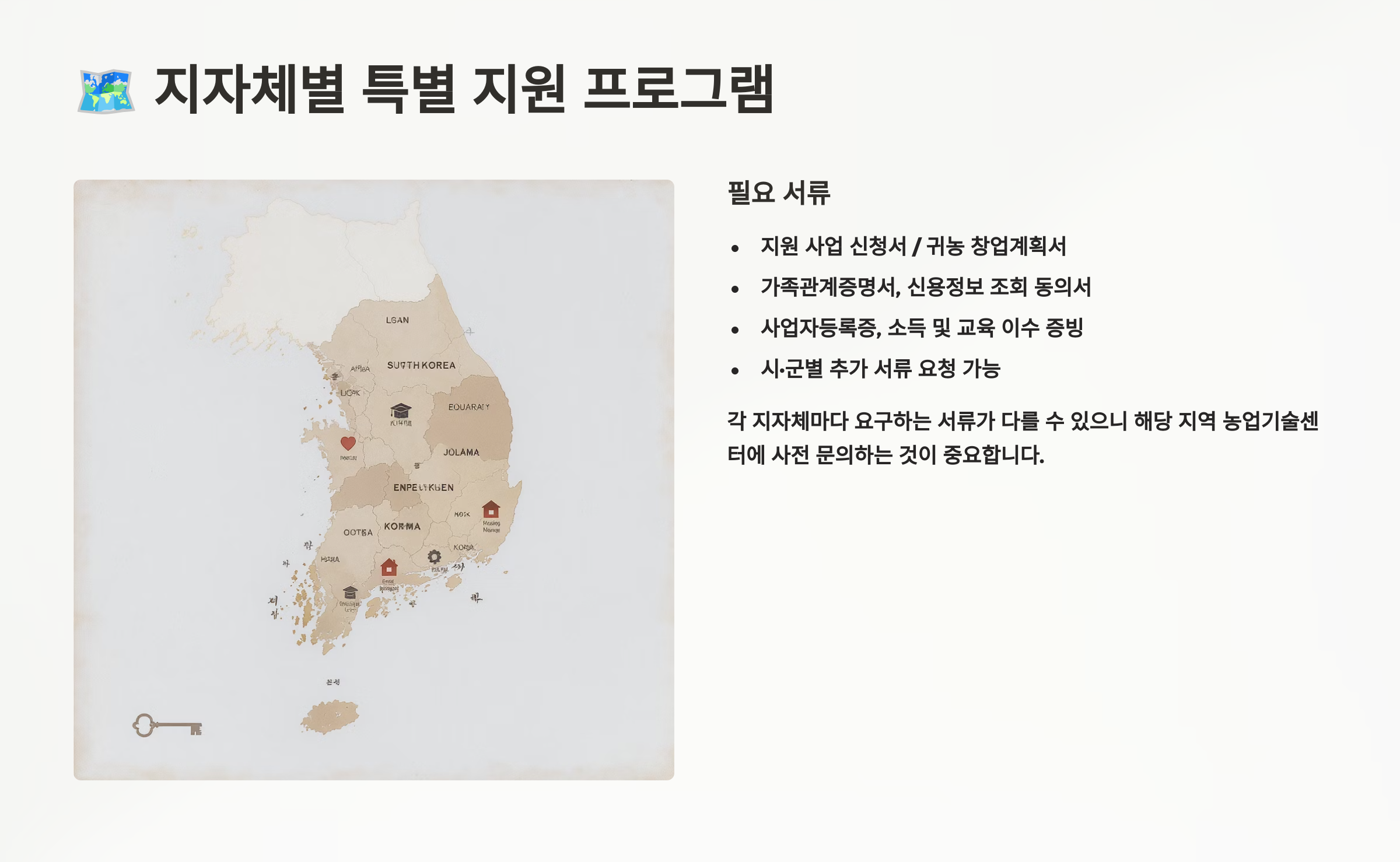 지자체별 특별 지원 프로그램도 다양해요. 강원도는 겨울철 난방비를 추가로 지원하고, 제주도는 감귤 농업 기술 교육과 판로 지원을 제공해요. 충청남도는 스마트팜 시설 설치비의 70%를 지원하는 특별 프로그램을 운영하고 있어요. 경기도는 도시 근교 농업의 특성을 살려 체험농장 조성 지원금을 별도로 제공한답니다.