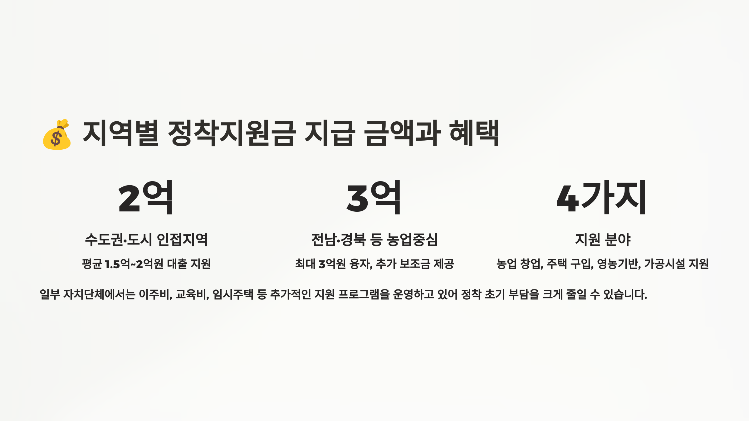 귀농귀촌 정착지원금의 지급 금액은 지역과 프로그램에 따라 천차만별이에요. 기본적으로 정부에서 지원하는 금액에 지자체가 추가로 지원하는 형태로 운영되고 있어요. 2025년 기준으로 가구당 최소 500만원에서 최대 1억원까지 지원받을 수 있으며, 융자를 포함하면 3억원 이상의 지원도 가능해요.