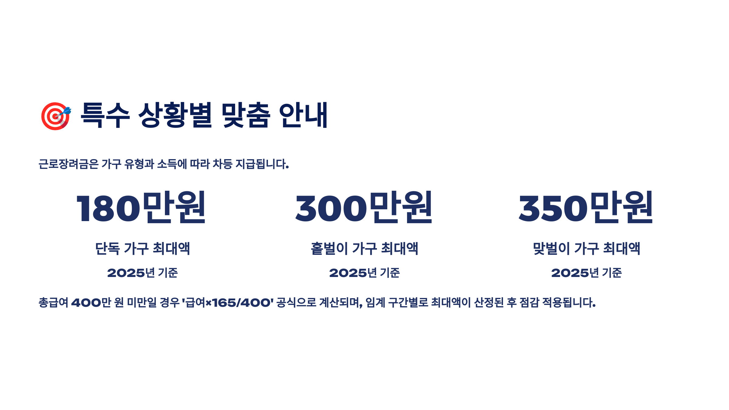 본 글은 2025년 근로장려금 제도에 대한 일반적인 정보를 제공하기 위해 작성되었습니다. 개인별 상황에 따라 자격 요건과 지급액이 달라질 수 있으며, 최종적인 판단은 국세청의 심사 결과에 따릅니다. 정확한 정보는 국세청 홈택스(www.hometax.go.kr) 또는 상담센터(1544-9944)를 통해 확인하시기 바랍니다. 본 정보는 2025년 1월 기준이며, 향후 정책 변경에 따라 내용이 달라질 수 있습니다.