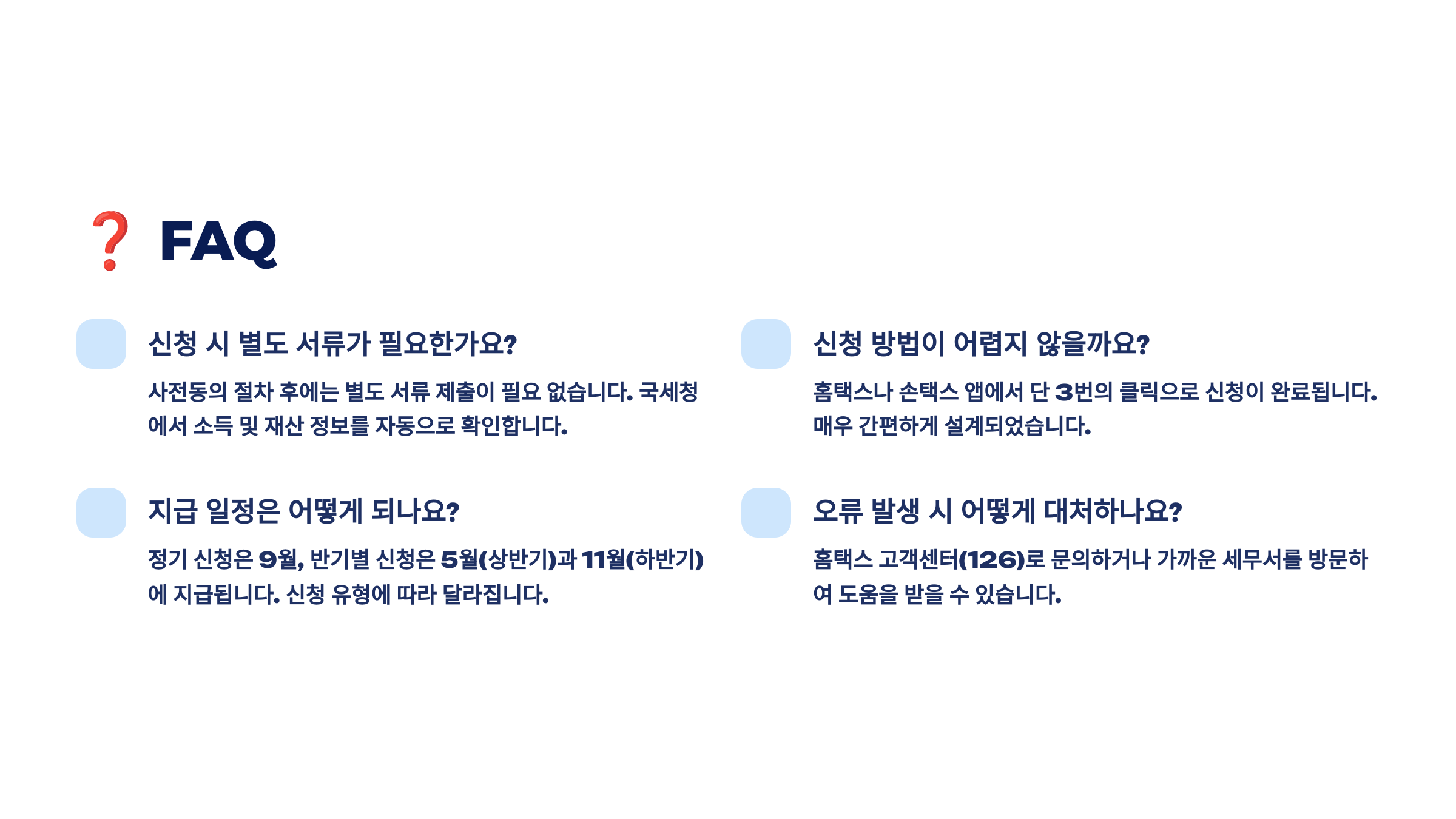 A2. 5월 정기신청 시 8월 말~9월 초에 지급됩니다. 기한 후 신청(6~11월)은 신청일로부터 4개월 이내 지급되며, 금액의 5%가 감액됩니다. 빠른 지급을 원한다면 5월 정기신청을 놓치지 마세요!