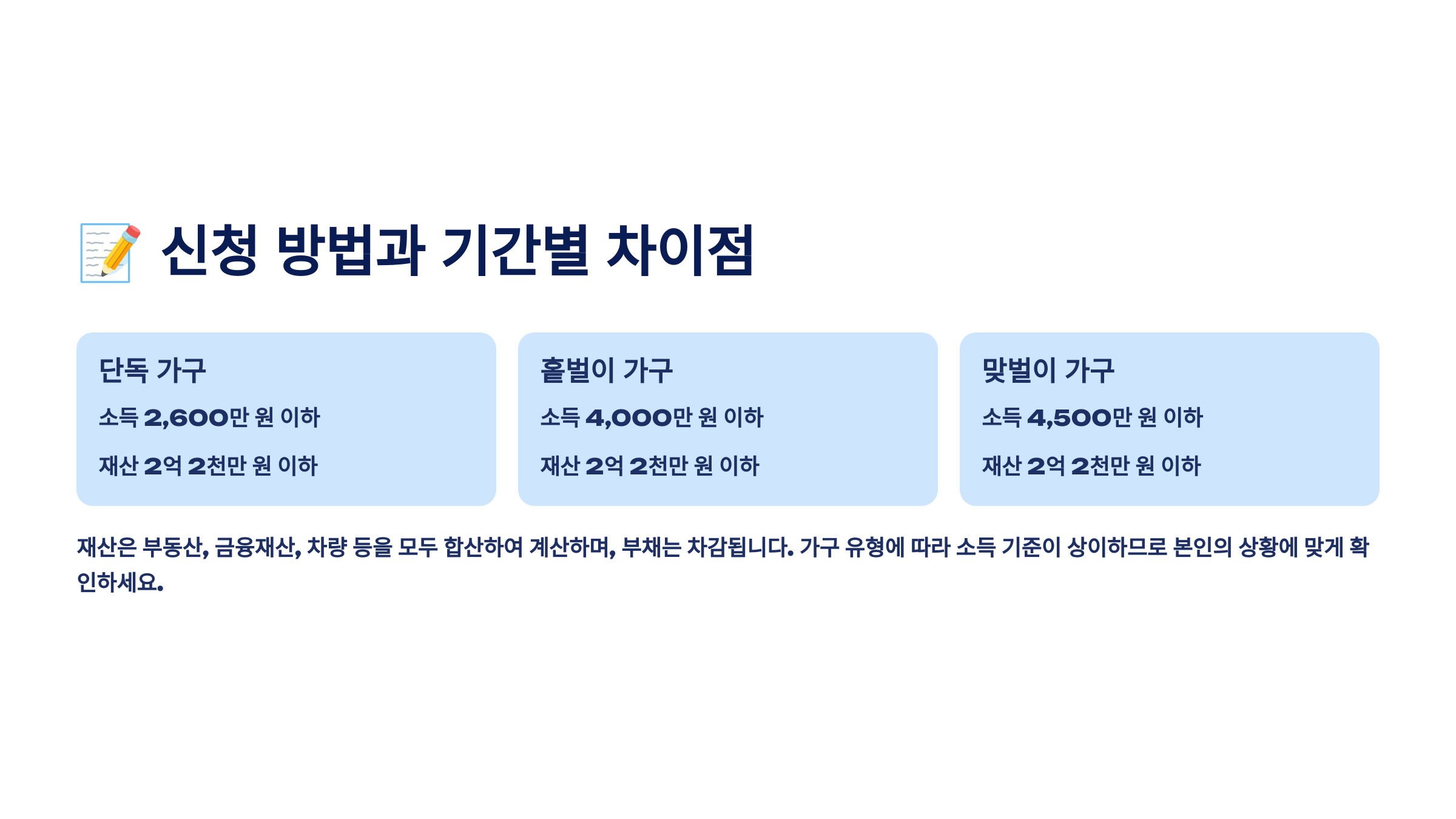 A1. 기준 중위소득 47% 이하인 가구는 가능성이 높아요. 2025년 기준 단독가구는 연소득 2,200만원, 홑벌이는 3,200만원, 맞벌이는 4,400만원 미만이면서 재산이 2.4억원 미만이면 신청 가능합니다. 가장 정확한 확인은 홈택스 모의계산을 이용하세요!
