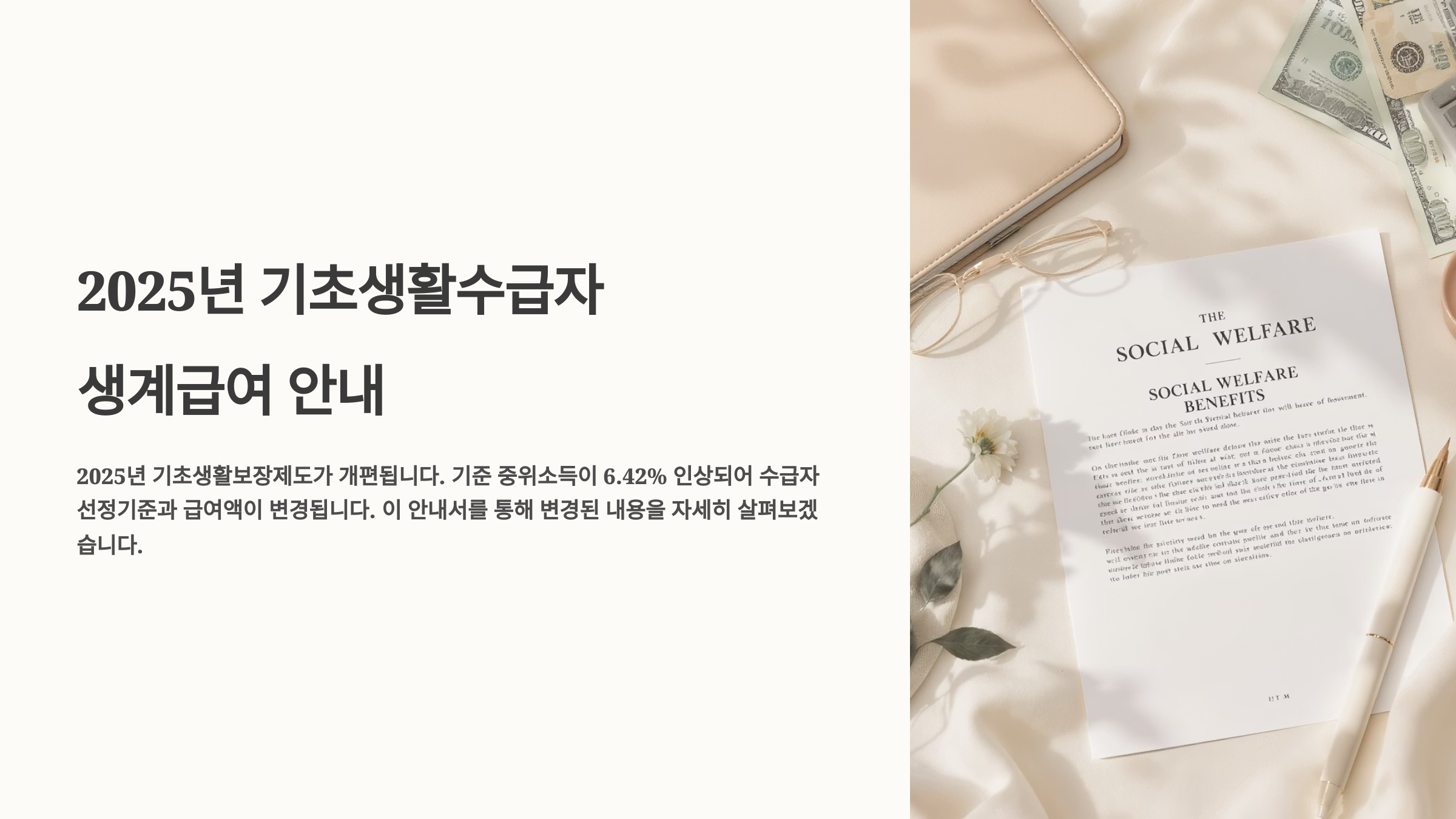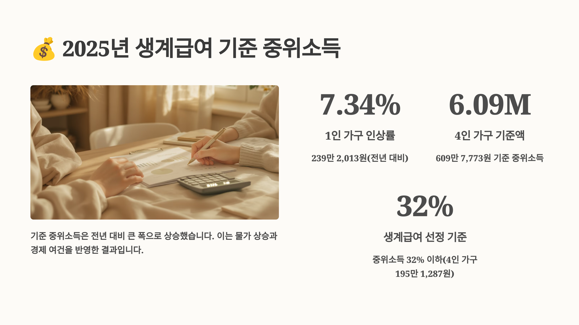 2025년 기초생활수급자 생계급여는 중위소득 32% 이하 가구에게 지원되는 복지제도예요. 올해는 중위소득이 인상되면서 더 많은 분들이 혜택을 받을 수 있게 되었답니다. 소득인정액이 생계급여 선정기준 이하인 경우 지원받을 수 있어요.