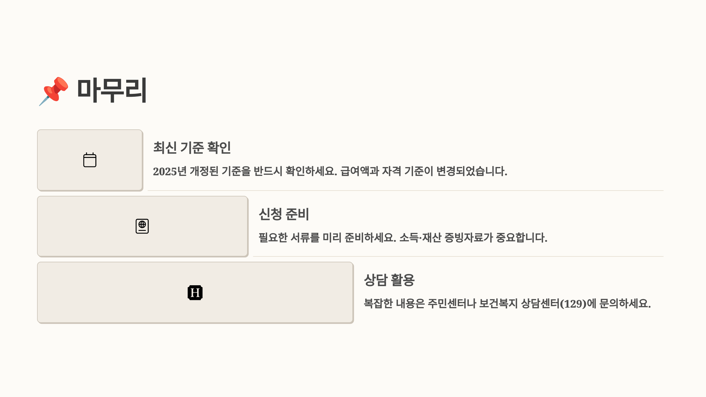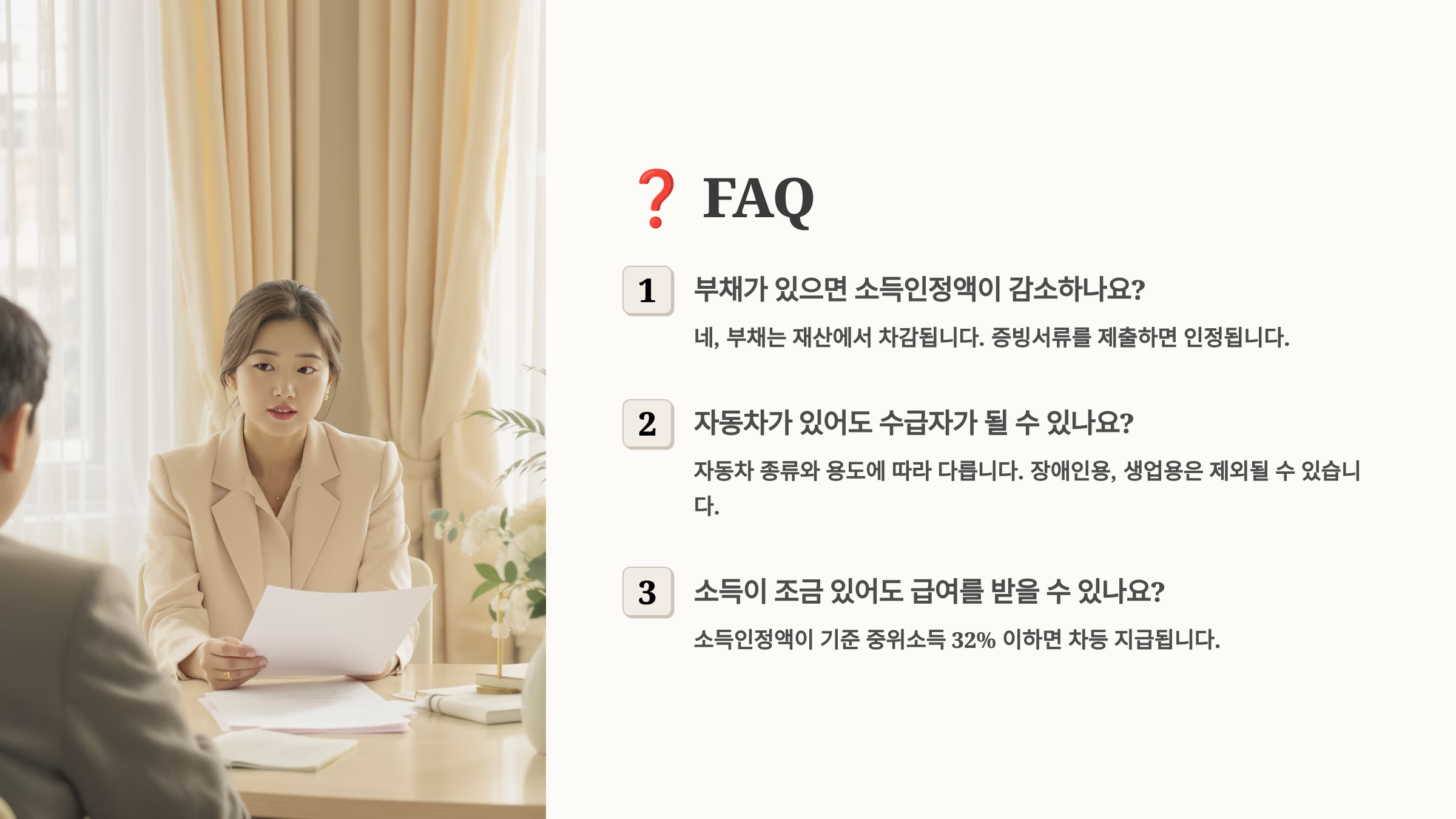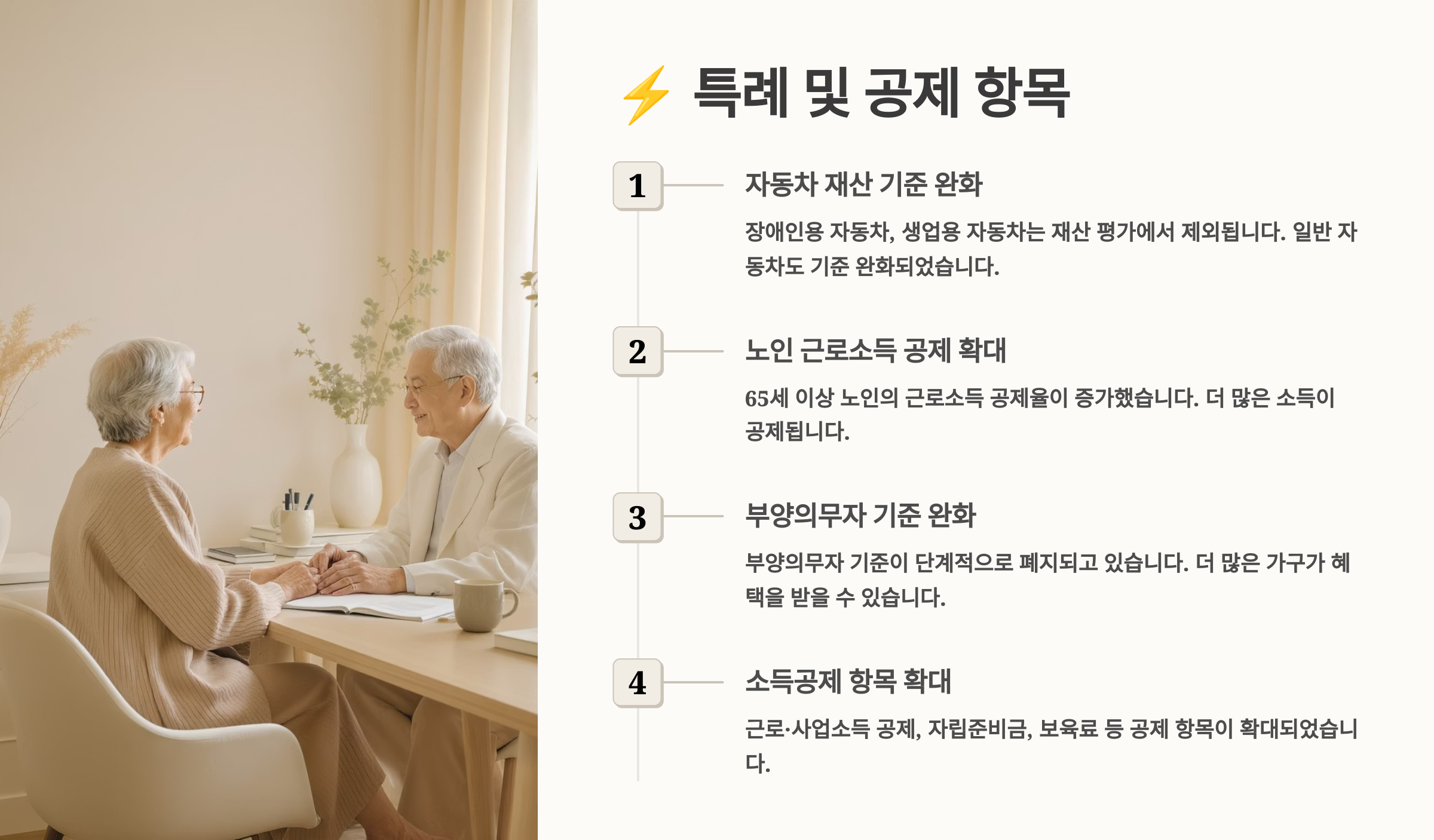 나의 생각으로는 이런 특례와 공제를 잘 활용하는 게 정말 중요해요. 같은 조건이라도 공제를 제대로 받느냐 못 받느냐에 따라 수급 여부가 갈릴 수 있거든요. 주민센터 담당자와 충분히 상담해서 놓치는 공제가 없는지 꼭 확인해보세요.