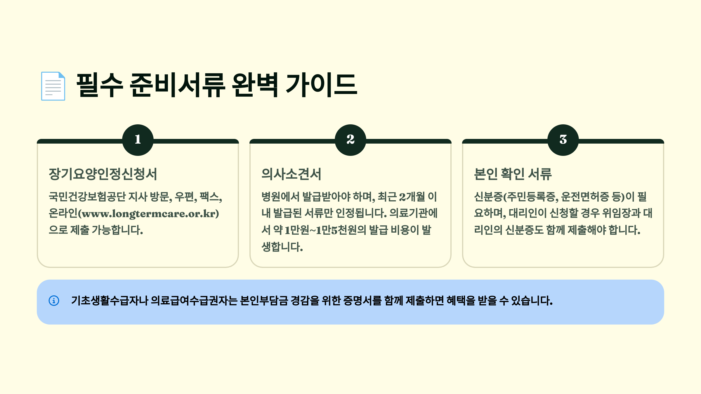 가장 중요한 서류는 의사소견서예요. 이는 장기요양 필요성을 의학적으로 증명하는 서류로, 반드시 의료기관에서 발급받아야 해요. 소견서 발급 비용은 약 2~3만원 정도이며, 의료급여 수급자는 무료로 발급받을 수 있답니다. 치매 진단을 받은 경우 치매진단서도 함께 제출하면 등급 판정에 유리해요.