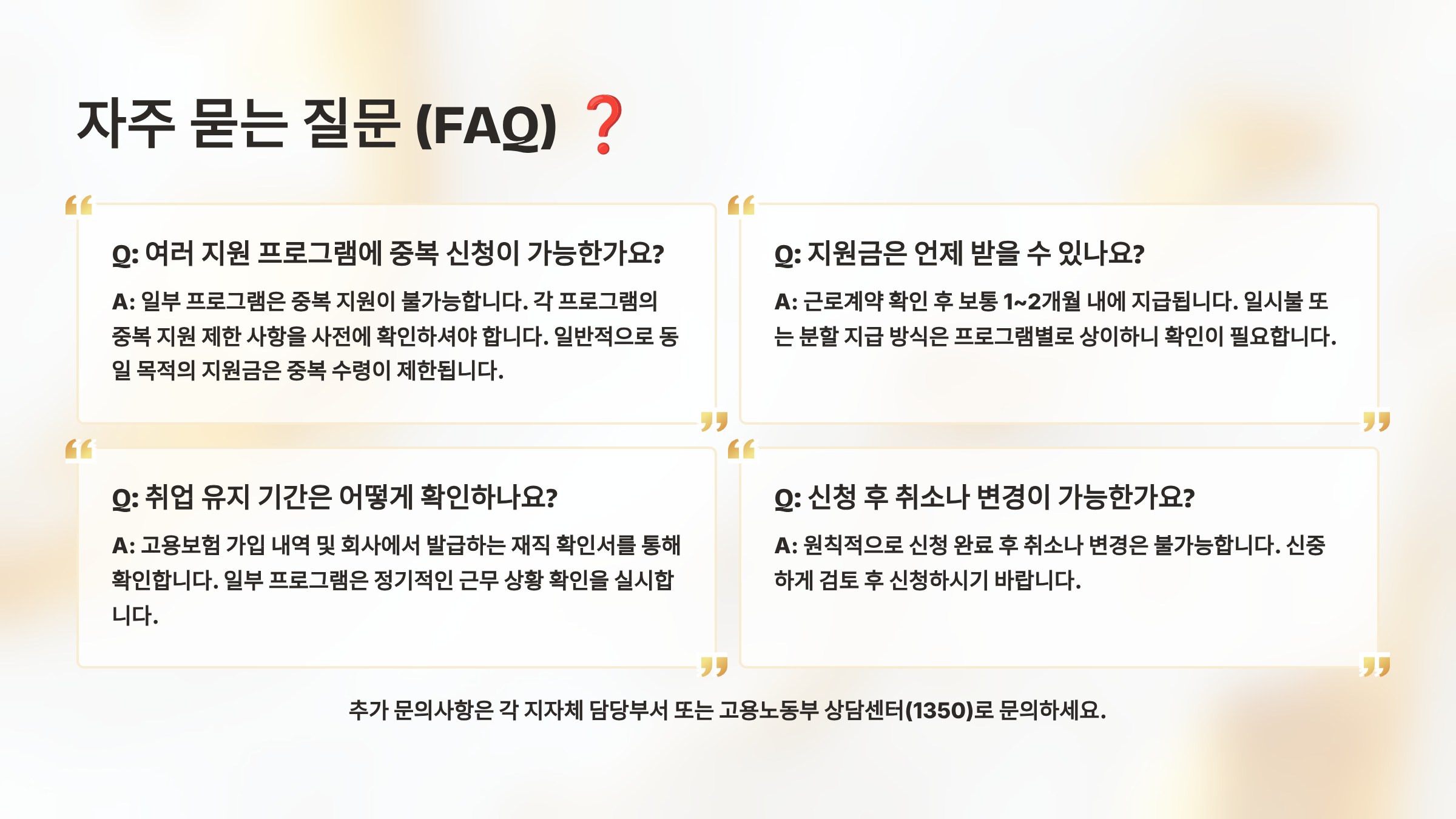 본 콘텐츠는 2025년 1월 기준 정보로 작성되었으며, 프로그램별 세부 사항은 변경될 수 있습니다. 정확한 신청 자격과 지원 내용은 워크넷(www.work.go.kr) 또는 해당 기관 공식 홈페이지에서 최신 정보를 확인하시기 바랍니다. 프로그램 신청 및 참여는 본인의 책임 하에 진행되며, 개인별 상황에 따라 지원 여부와 금액이 달라질 수 있습니다.