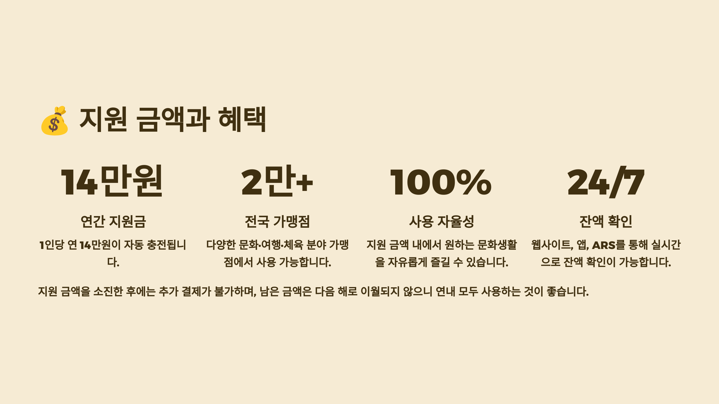 가족 단위로 계산하면 혜택이 상당해요. 4인 가족이라면 연간 52만원을 지원받는 셈이죠. 이 정도면 매달 영화를 보거나 도서를 구입하고, 가끔 공연도 관람할 수 있는 금액이에요. 문화생활의 질이 확실히 달라진답니다.