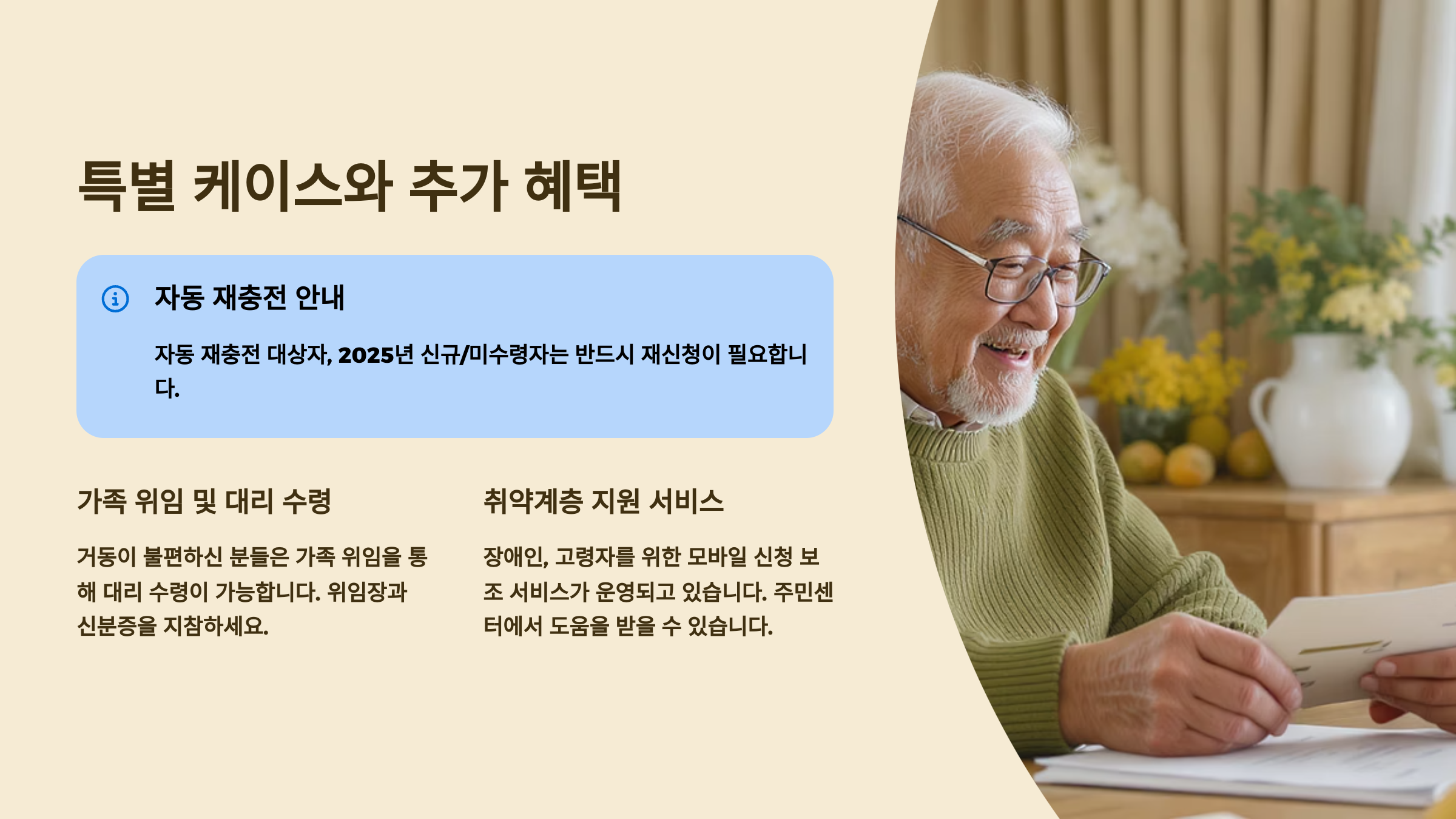 특별한 경우들도 있어요. 예를 들어 시설 거주자의 경우에는 시설장이 대리 신청할 수 있고, 장애인의 경우에는 활동보조인이 대리 신청할 수 있어요. 병원에 입원 중인 경우에도 가족이 대리 신청할 수 있으니, 상황에 맞게 신청 방법을 선택하면 돼요.