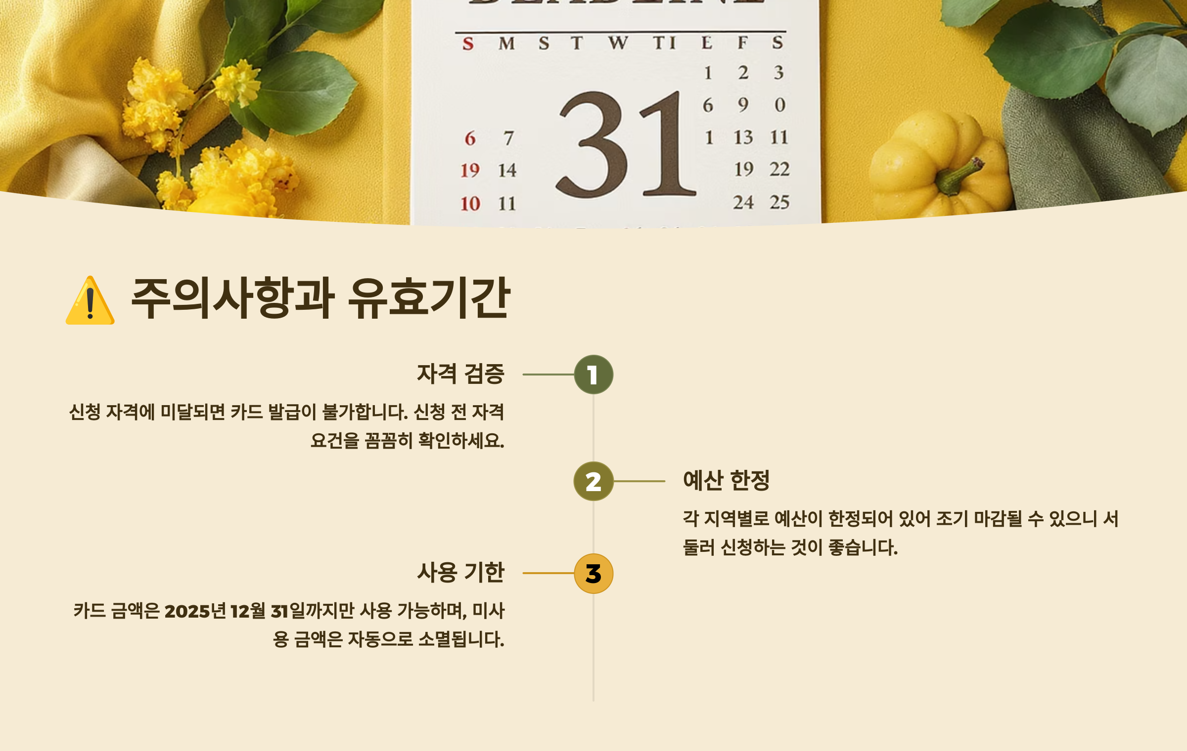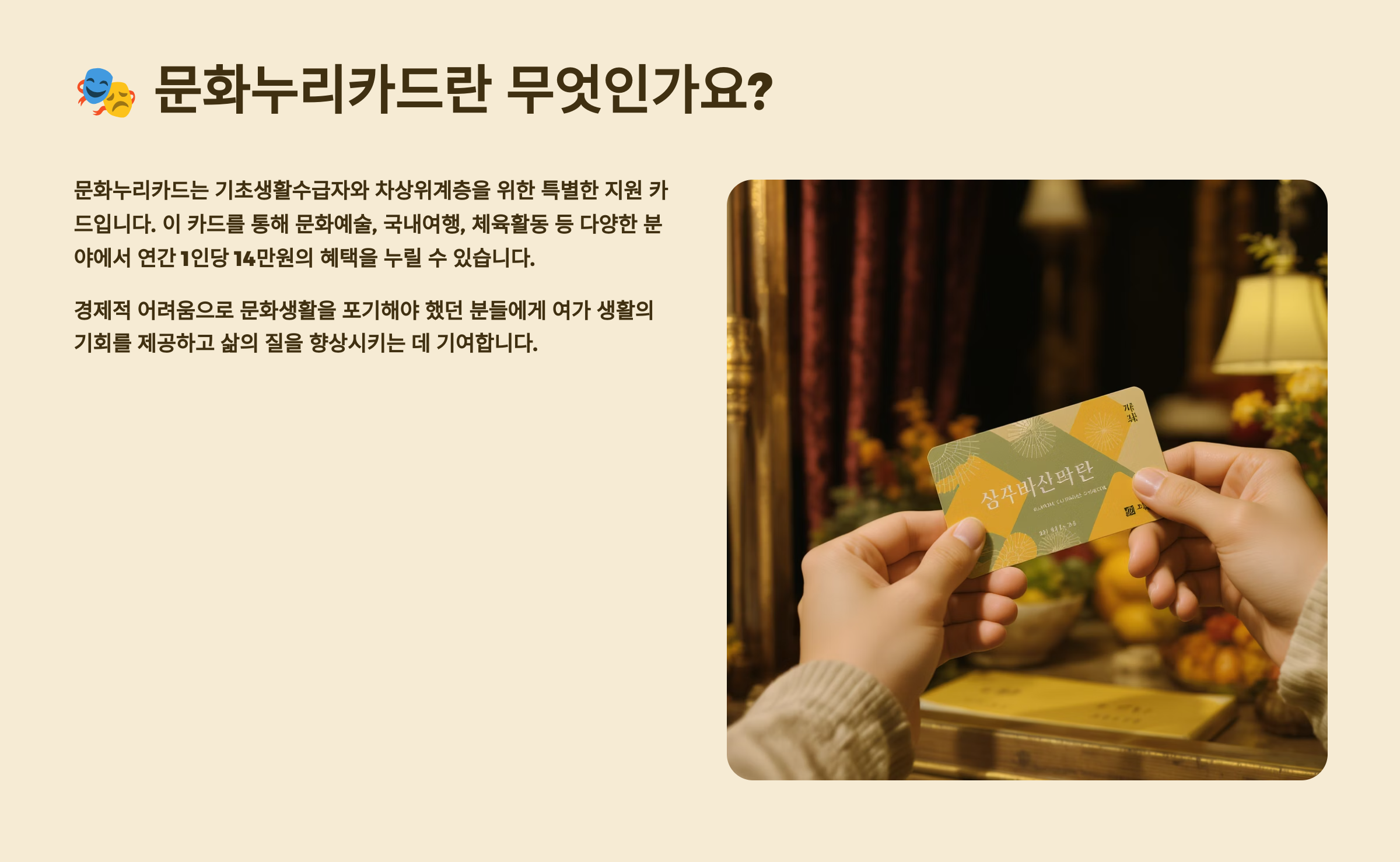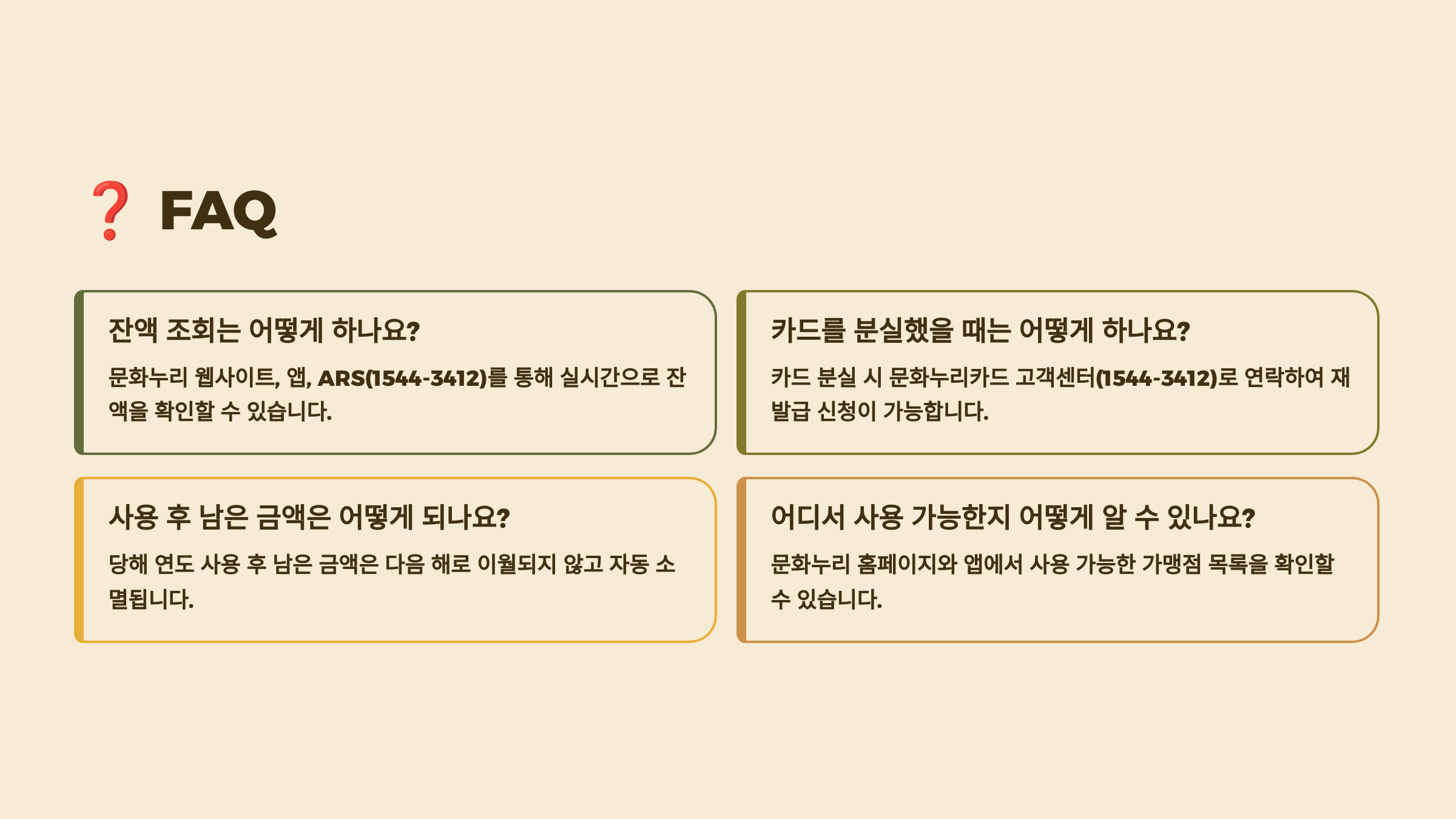 본 글의 정보는 2025년 1월 기준으로 작성되었으며, 정책 변경에 따라 내용이 달라질 수 있습니다. 정확한 정보는 문화누리카드 공식 홈페이지(www.mnuri.kr)나 고객센터(1544-3412)를 통해 확인하시기 바랍니다. 본 글은 정보 제공 목적으로 작성되었으며, 개인의 상황에 따라 적용이 다를 수 있습니다.