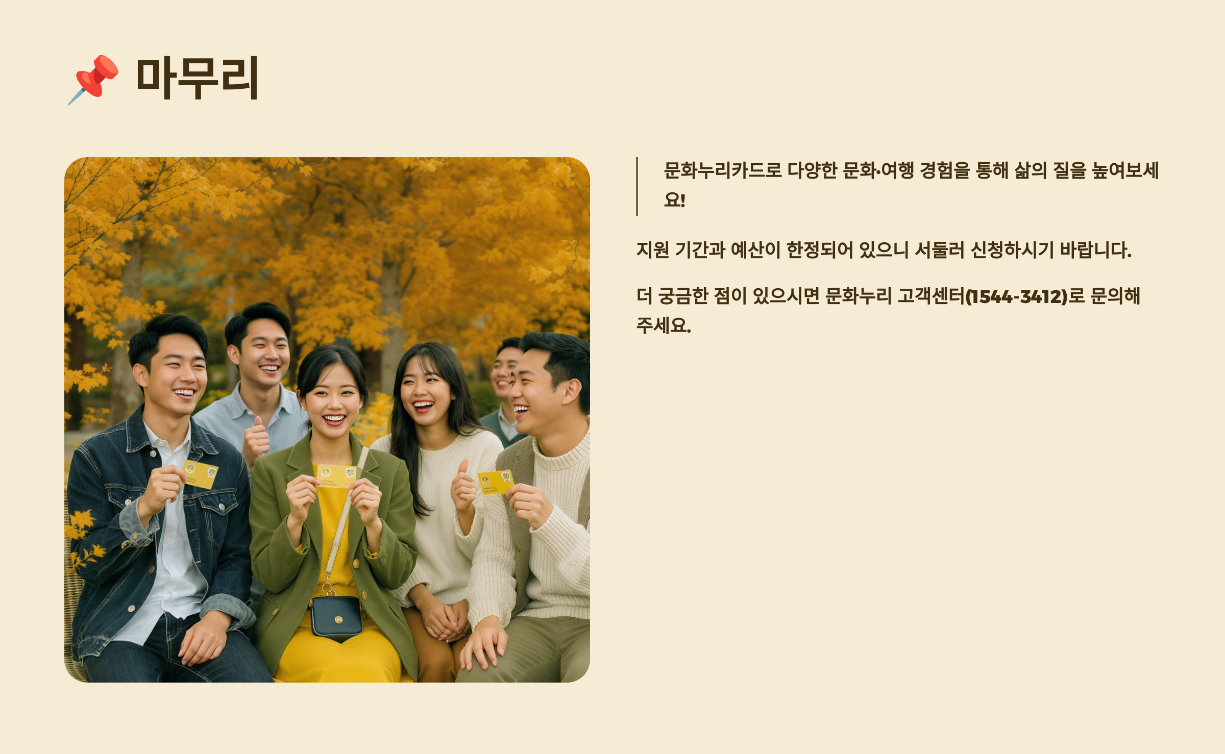 더 궁금한 사항이 있으시면 문화누리카드 홈페이지나 고객센터를 이용해주세요. 여러분의 행복한 문화생활을 응원합니다! 🌟