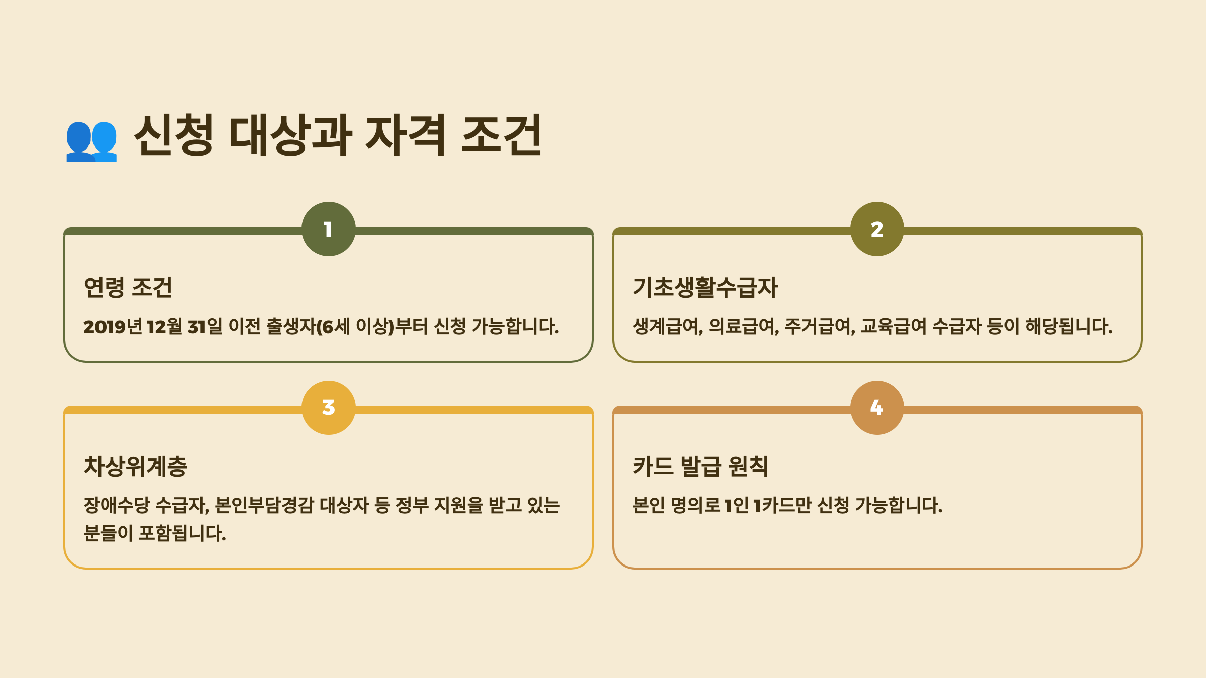 나이 제한은 만 6세 이상이에요. 2025년 기준으로는 2019년 12월 31일 이전 출생자부터 신청할 수 있답니다. 상한 나이는 없어서 어르신들도 모두 신청 가능해요. 가족 구성원 각자가 개별적으로 신청해야 하고, 1인당 13만원씩 지원받을 수 있어요. 👨👩👧👦