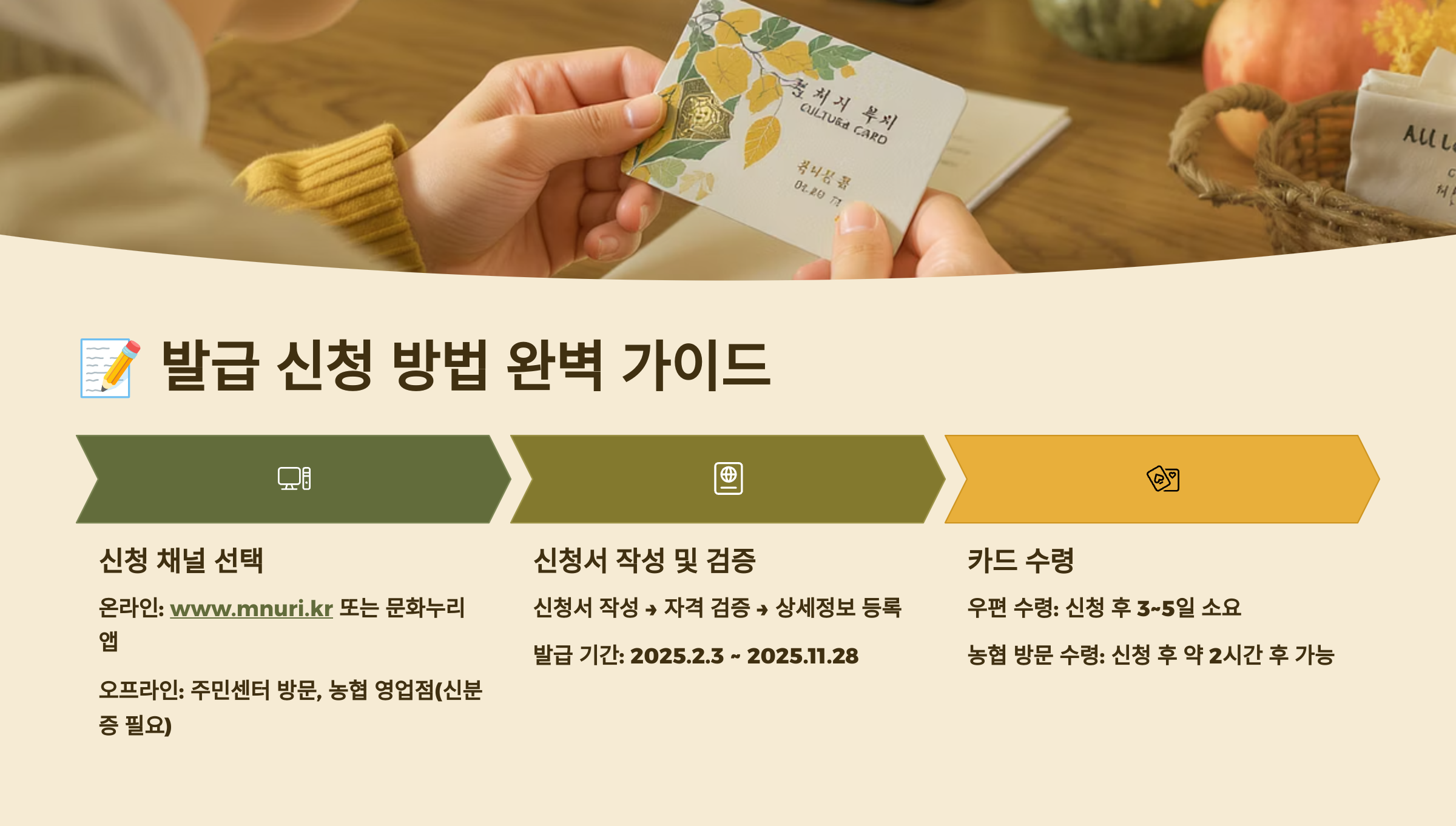 온라인 신청은 문화누리카드 홈페이지(www.mnuri.kr)나 모바일 앱에서 할 수 있어요. 먼저 본인인증을 하고, 발급 자격을 확인한 후, 카드사를 선택하면 돼요. 농협카드나 롯데카드 중에서 선택할 수 있는데, 사용처는 동일하니 편한 곳을 선택하세요.