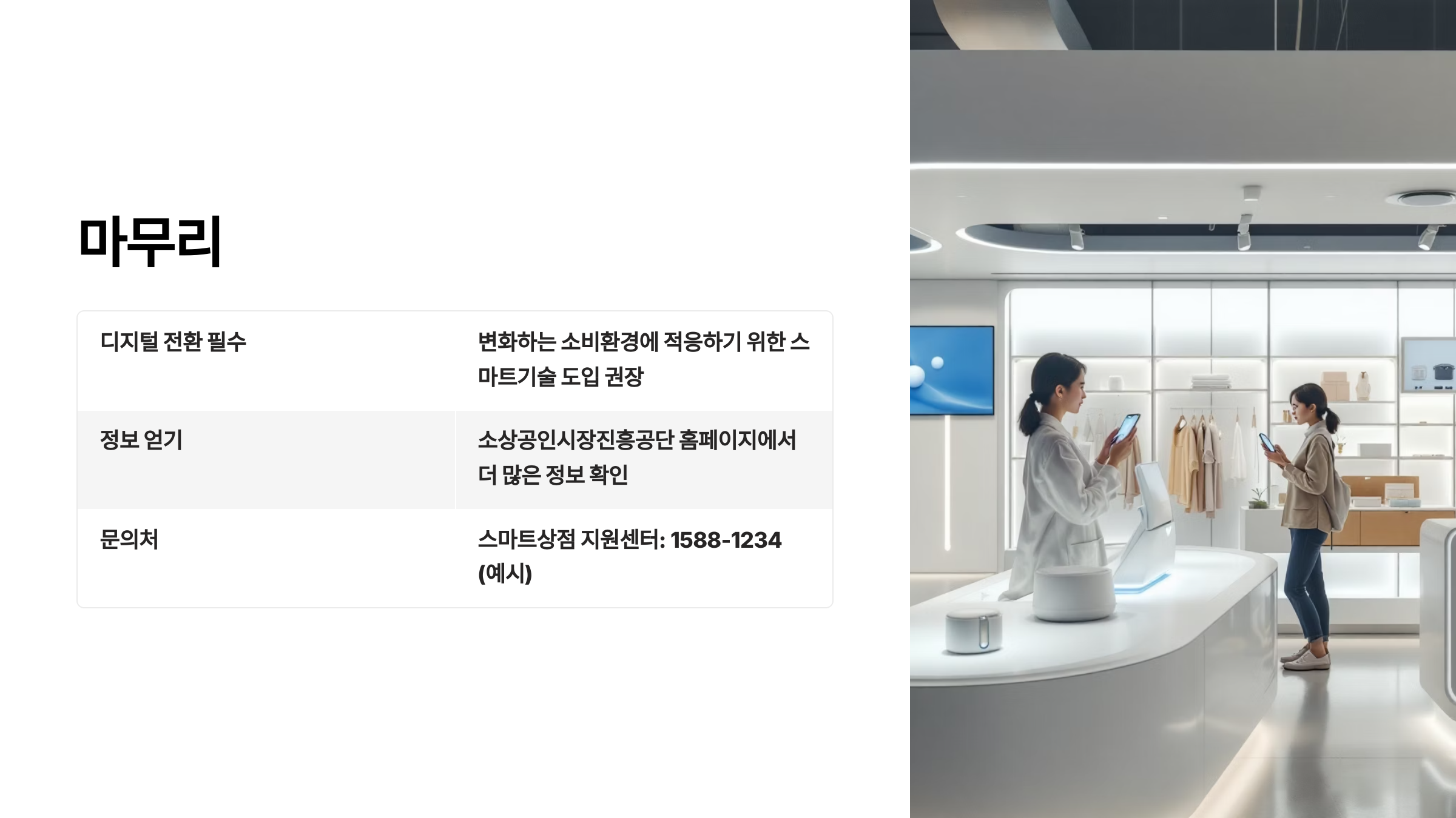 앞으로도 정부의 소상공인 지원정책은 계속 확대될 예정이니까, 이런 기회들을 놓치지 말고 적극적으로 활용하시기 바라요. 스마트상점 지원사업을 통해 여러분의 사업이 한 단계 더 성장할 수 있기를 진심으로 응원합니다!