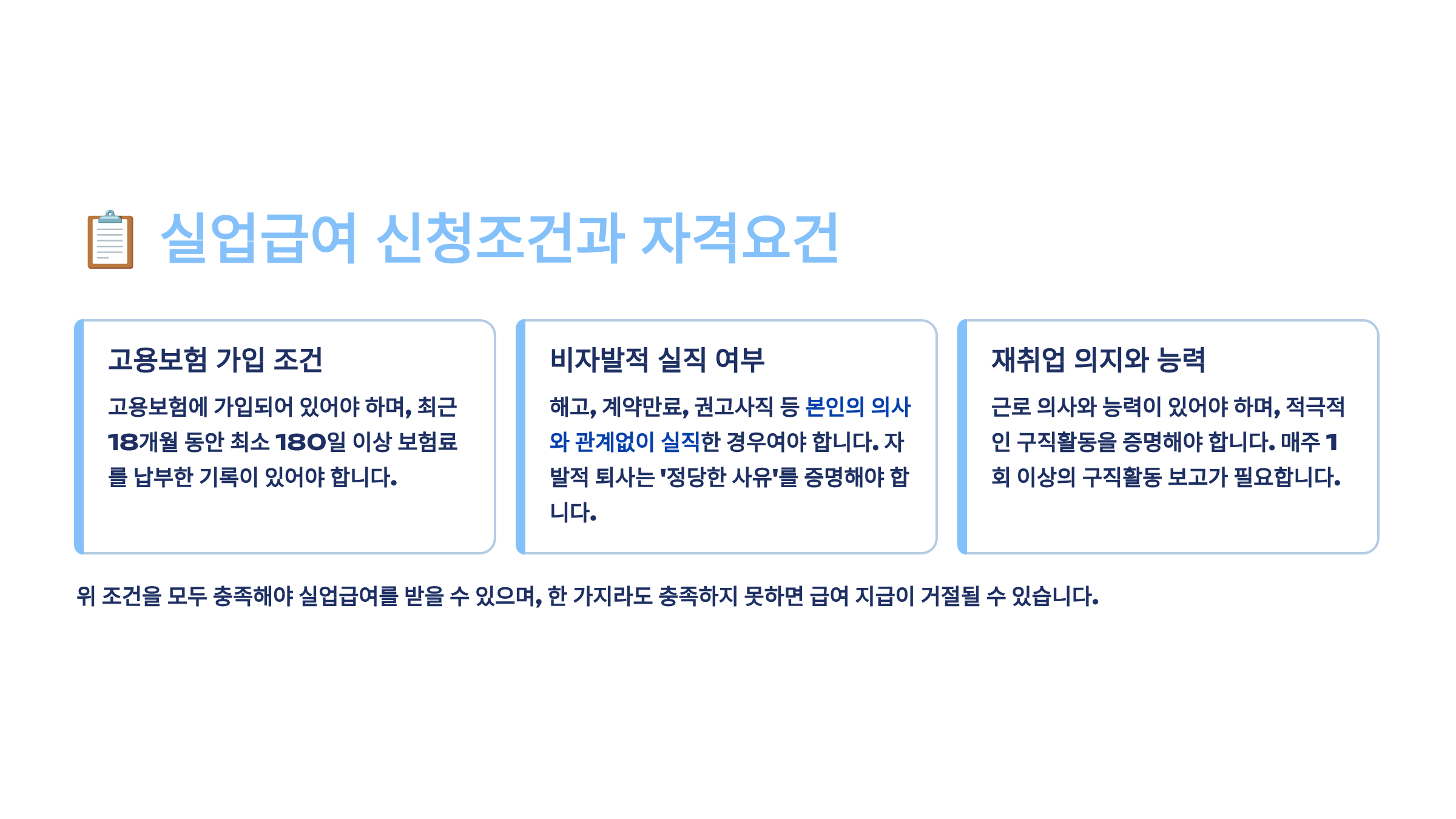 A1. 고용보험 가입 기간이 이직일 이전 18개월 동안 180일 이상이고 비자발적 이직이면 가능해요. 2025년 기준으로 더욱 완화된 조건이 적용됩니다.