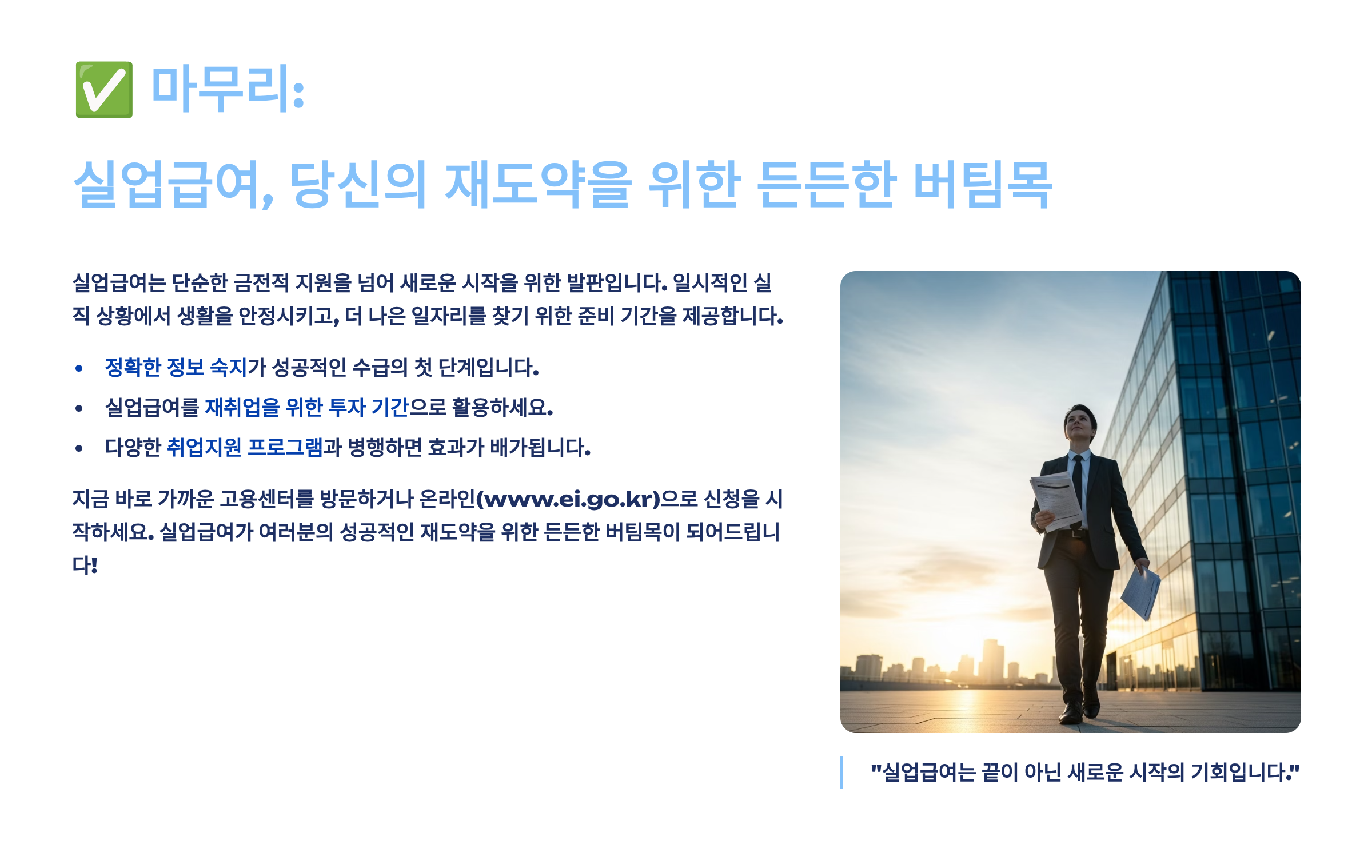 실업급여는 단순한 생계비 지원을 넘어서 새로운 기회를 찾을 수 있는 발판이 될 수 있어요. 직업훈련을 통해 새로운 기술을 익히거나, 창업 지원을 받아 새로운 도전을 할 수도 있고, 체계적인 취업 지원을 통해 더 좋은 조건의 일자리를 찾을 수도 있답니다. 어려운 시기일수록 포기하지 말고 적극적으로 지원 제도를 활용해서 더 나은 미래를 준비하시기 바라요. 여러분의 성공적인 재취업을 진심으로 응원합니다! 🌟
