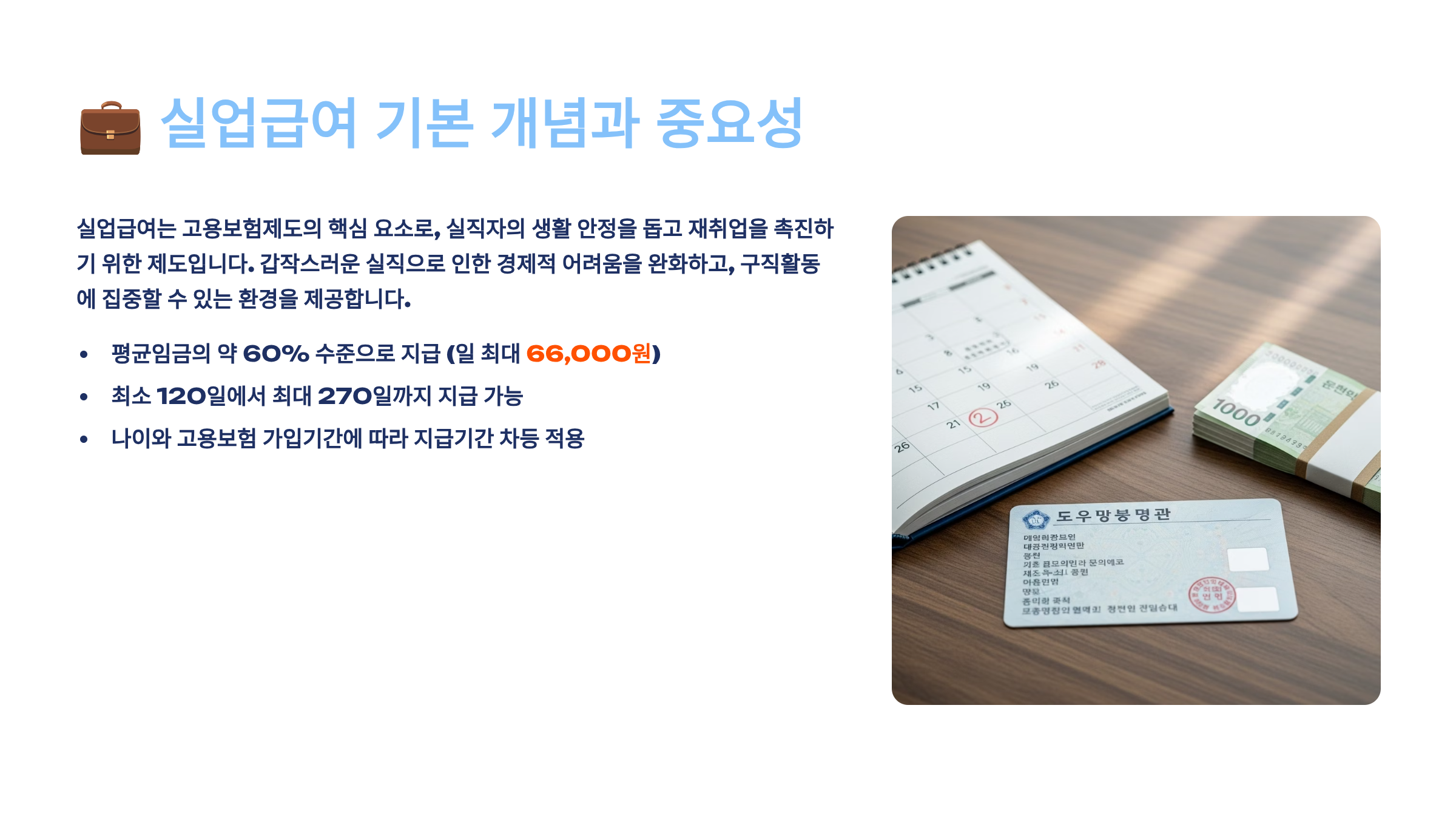 실업급여는 고용보험법에 따라 운영되는 대표적인 사회보험 급여 중 하나예요. 근로자가 비자발적으로 실업 상태가 되었을 때 일정 기간 동안 생계비를 지원해주는 제도로, 1995년 고용보험제도 도입과 함께 시작되었답니다. 현재까지 수많은 실업자들에게 경제적 안정을 제공하며 사회 안전망 역할을 톡톡히 하고 있어요. 실업급여는 단순한 생계비 지원을 넘어서 실업자의 인간다운 삶을 보장하고 사회 통합에 기여하는 중요한 의미를 가지고 있답니다.