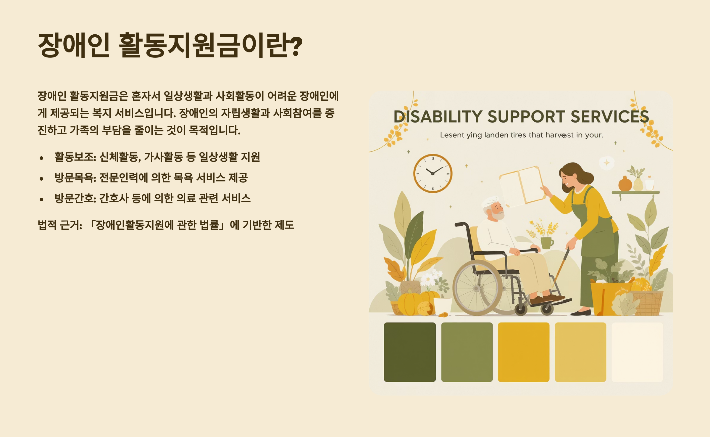 장애인 활동지원 서비스는 신체적·정신적 장애로 일상생활과 사회생활이 어려운 장애인에게 활동지원급여를 제공하는 사회서비스예요. 2011년부터 시행된 이 제도는 장애인의 자립생활을 지원하고 가족의 부담을 덜어주는 중요한 역할을 하고 있답니다. 활동보조인이 가정을 방문하거나 외출 시 동행하여 신체활동, 가사활동, 사회활동 등을 지원해요. 2025년부터는 지원 시간이 확대되고 본인부담금도 완화되어 더 많은 장애인들이 혜택을 받을 수 있게 되었어요.