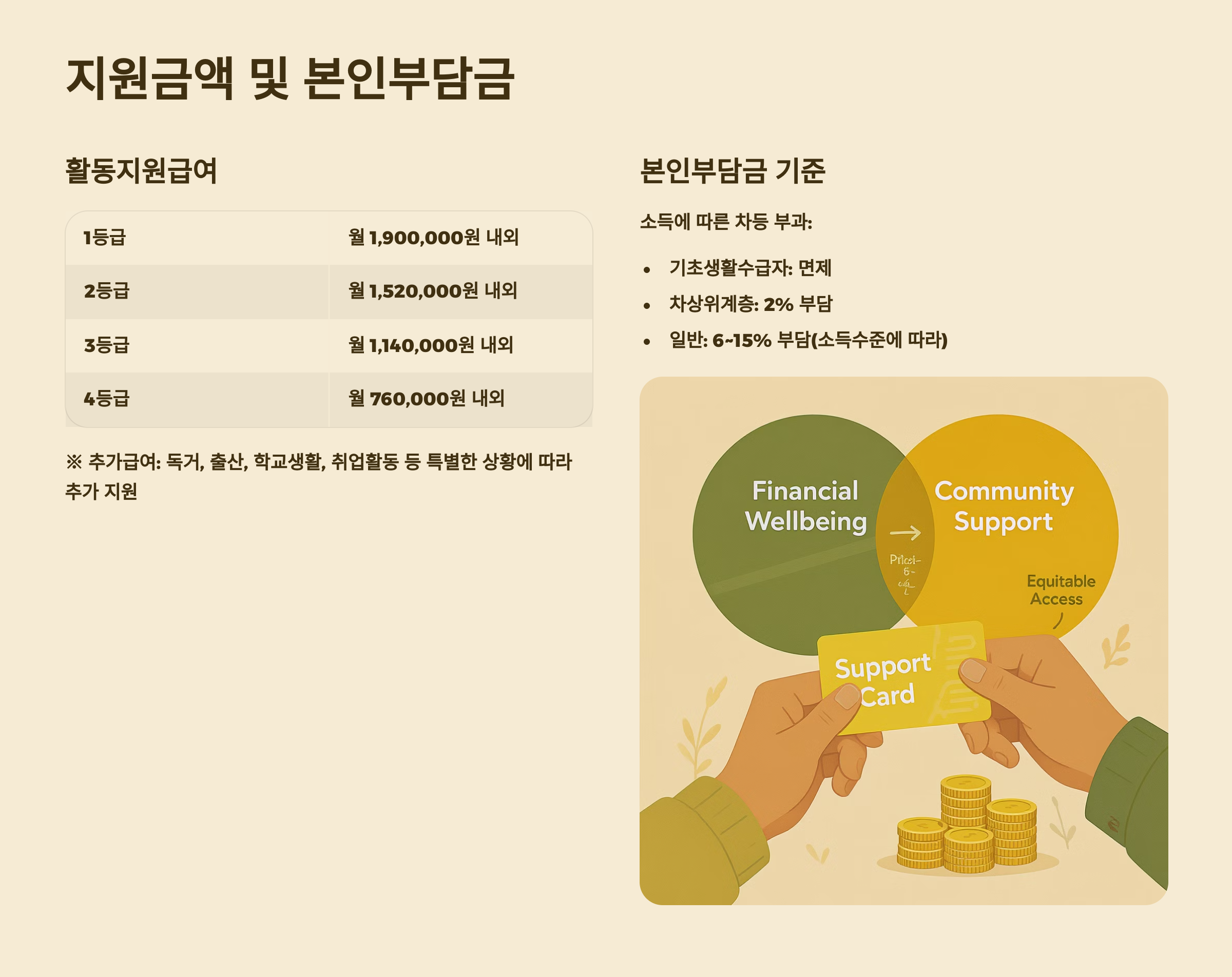 소득 기준은 따로 없어요! 활동지원 서비스는 소득 수준과 관계없이 모든 등록장애인이 신청할 수 있답니다. 다만 소득 수준에 따라 본인부담금이 차등 적용되는데, 기초생활수급자는 본인부담금이 면제되고, 차상위계층은 2만원, 그 외의 경우는 소득 수준에 따라 4~15% 정도의 본인부담금을 내게 돼요. 이렇게 소득에 관계없이 서비스를 이용할 수 있도록 한 것은 장애로 인한 추가 비용 부담을 사회가 함께 나누자는 취지랍니다.