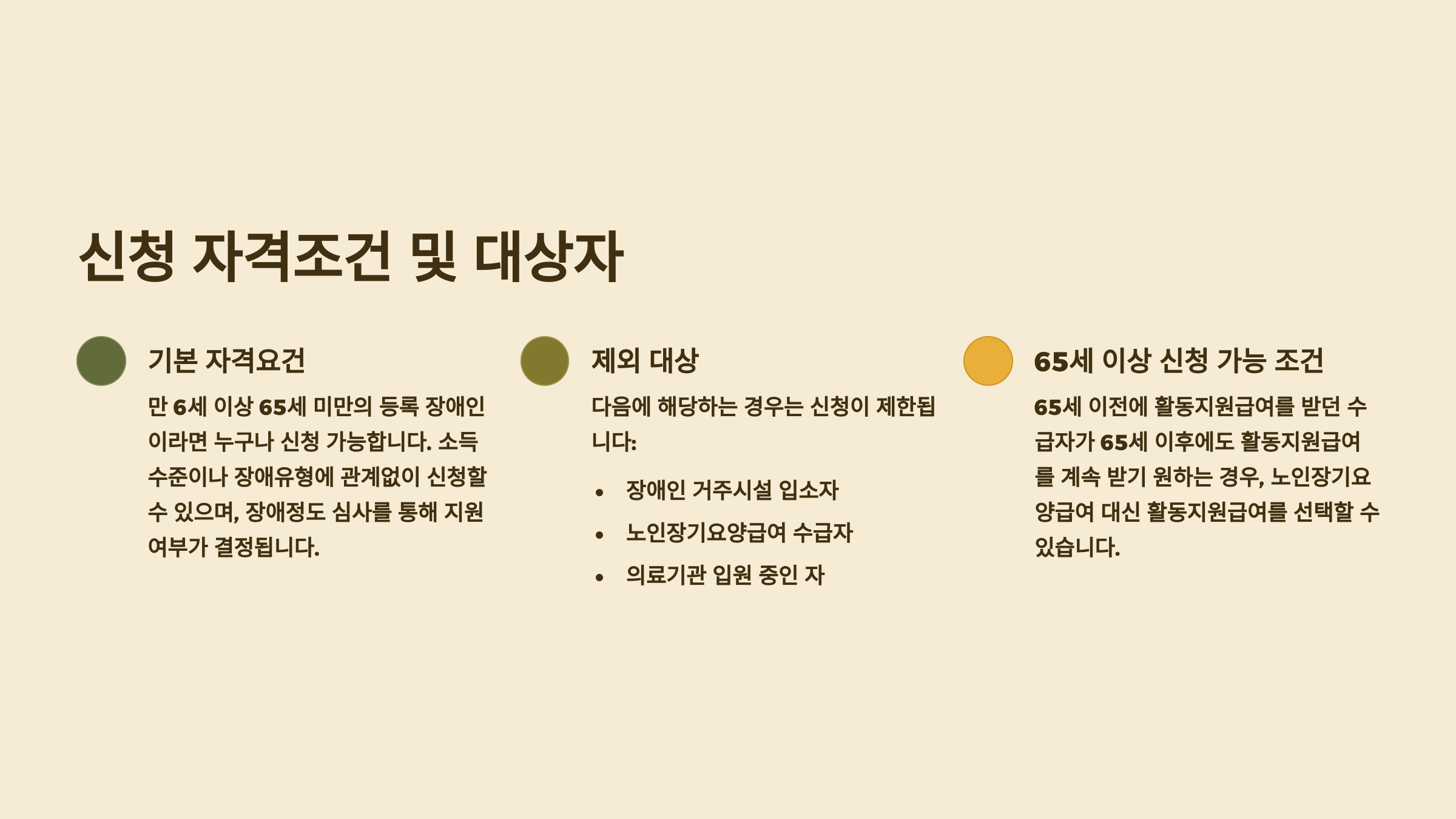 연령 조건을 좀 더 자세히 살펴보면, 만 6세 이상 만 65세 미만이 기본 대상이에요. 하지만 2025년부터는 65세 이상이어도 몇 가지 예외 조건에 해당하면 신청이 가능해졌어요. 예를 들어, 활동지원 수급자였다가 65세 이후에 노인장기요양 수급자로 전환되었는데 장기요양급여가 활동지원급여보다 적은 경우, 활동지원 서비스를 신청할 수 있어요. 또한 65세 미만에 노인성 질병으로 장기요양 수급자가 되었다가 등록장애인이 된 경우에도 활동지원을 신청할 수 있답니다. 시설 입소 장애인이 퇴소를 희망하는 경우에도 65세 이상이라도 활동지원 신청이 가능해요.