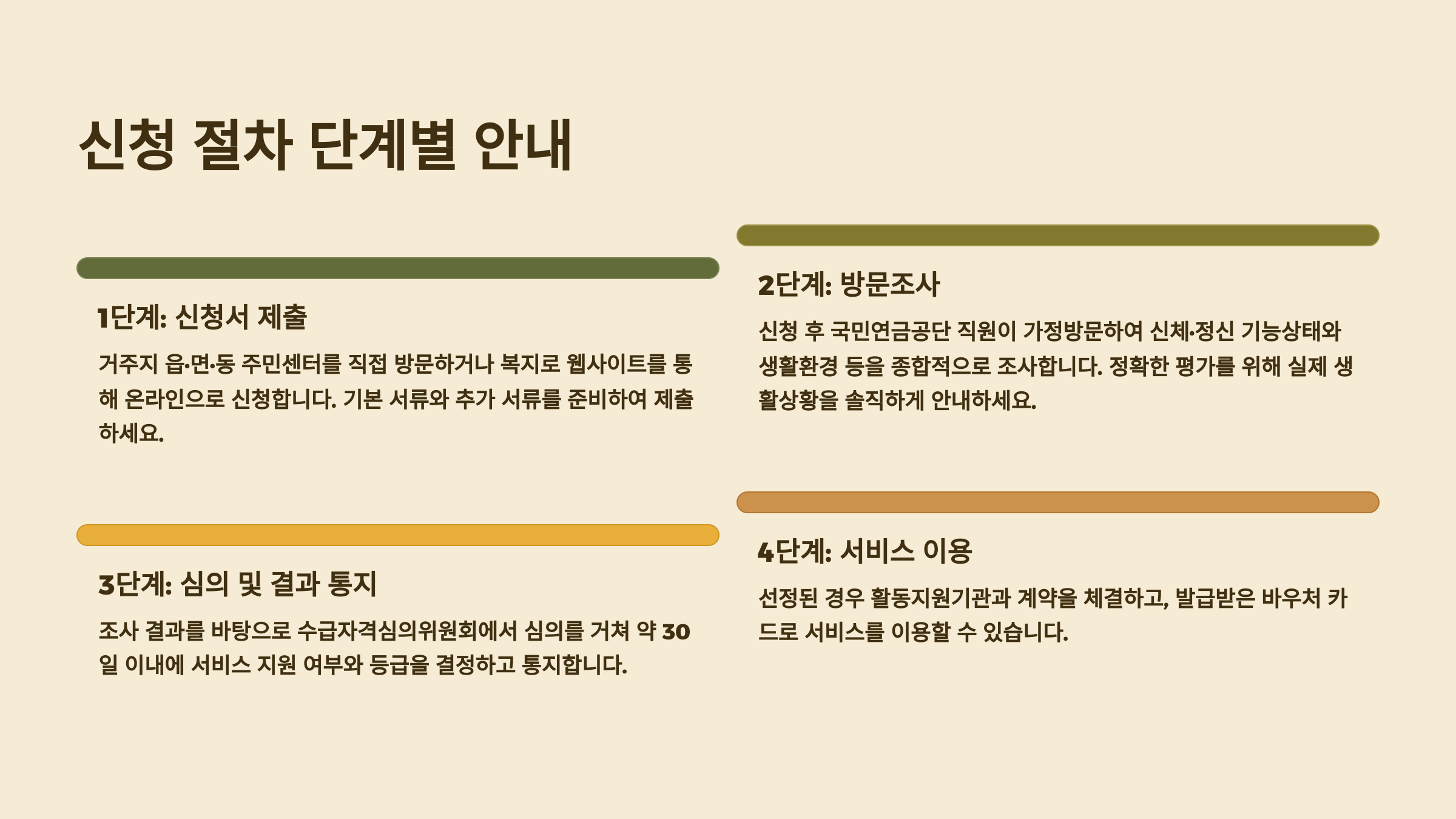 활동지원 서비스를 받으려면 먼저 읍면동 주민센터나 국민연금공단 지사에 신청해야 해요. 신청 후에는 국민연금공단에서 방문조사를 실시하고, 시군구에서 수급자격과 급여량을 결정하게 됩니다. 나의 생각에는 처음 신청하시는 분들은 주민센터에서 상담을 받으면서 신청하는 것이 가장 편리할 것 같아요. 결정된 급여량에 따라 바우처 카드가 발급되고, 이를 이용해 원하는 제공기관에서 서비스를 받을 수 있어요. 서비스 이용 시에는 본인부담금이 있지만, 소득 수준에 따라 차등 적용되므로 부담이 크지 않답니다.