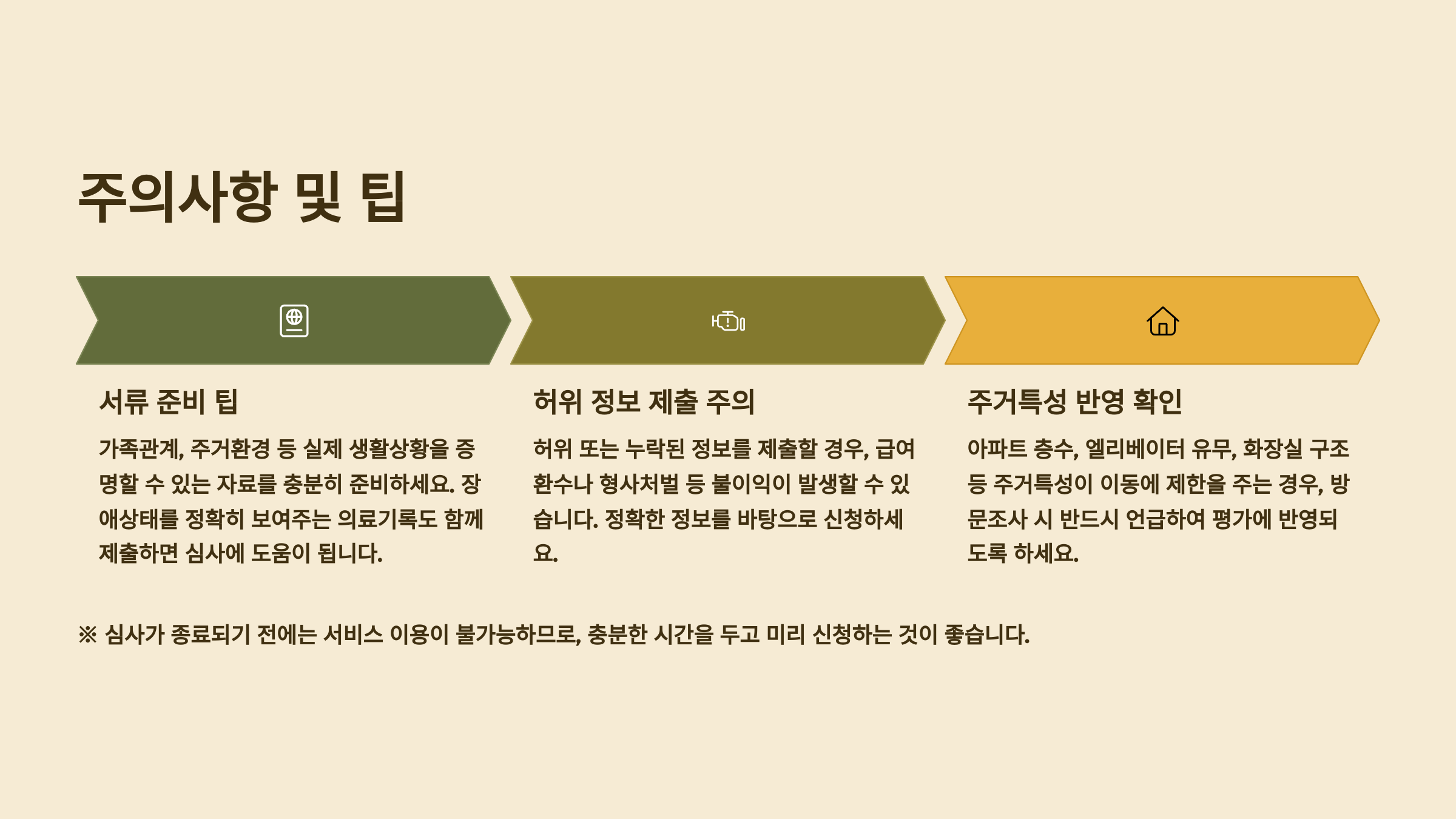 서류 준비 시 주의사항도 있어요. 모든 서류는 최근 3개월 이내에 발급받은 것이어야 하고, 사본을 제출하는 경우에는 원본 대조필 도장을 받아야 해요. 온라인으로 발급받은 서류도 인정되지만, 일부 서류는 반드시 원본을 제출해야 하니 미리 확인하세요. 특히 의료 관련 서류는 병원에서 발급받는 데 시간이 걸릴 수 있으니 미리 준비하는 것이 좋답니다. 서류가 미비한 경우 보완 요청을 받게 되고, 이로 인해 신청 처리가 지연될 수 있어요.