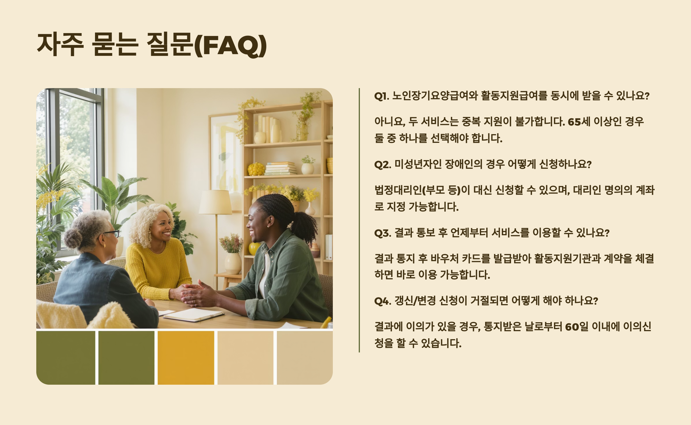 신청 과정이 복잡해 보일 수 있지만, 주민센터나 국민연금공단에서 친절하게 도와주니 걱정하지 마세요. 필요한 서류를 미리 준비하고, 방문조사 시 일상생활의 어려움을 솔직하게 이야기하면 적절한 지원을 받을 수 있어요. 또한 서비스 이용 중에도 상황이 변하면 언제든지 변경 신청을 할 수 있고, 제공기관이나 활동지원사도 자유롭게 바꿀 수 있으니 만족스러운 서비스를 받을 때까지 적극적으로 요구하세요. 활동지원 서비스는 여러분의 권리이자, 더 나은 삶을 위한 디딤돌이랍니다.