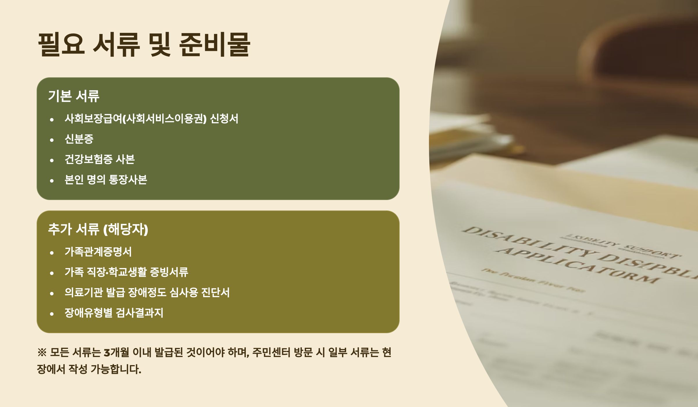 | 장애인등록증 | 필수 | 복지카드 가능 |