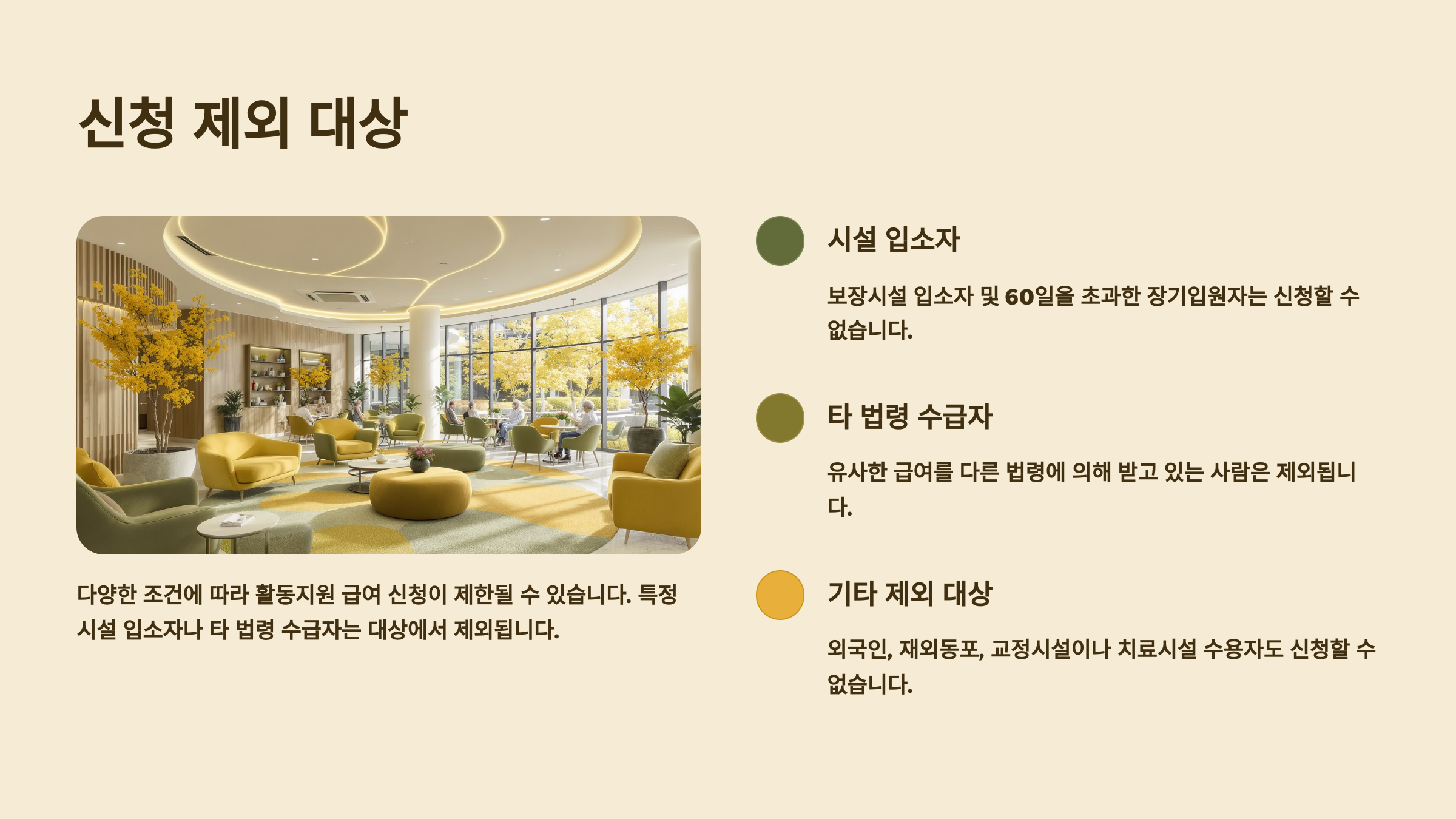 신청이 제한되는 경우도 있어요. 노인장기요양보험 대상자, 장애인 거주시설 입소자, 의료기관에 30일 이상 입원 중인 경우는 신청할 수 없답니다. 하지만 퇴원이나 퇴소 예정이라면 미리 신청해둘 수 있으니 참고하세요!