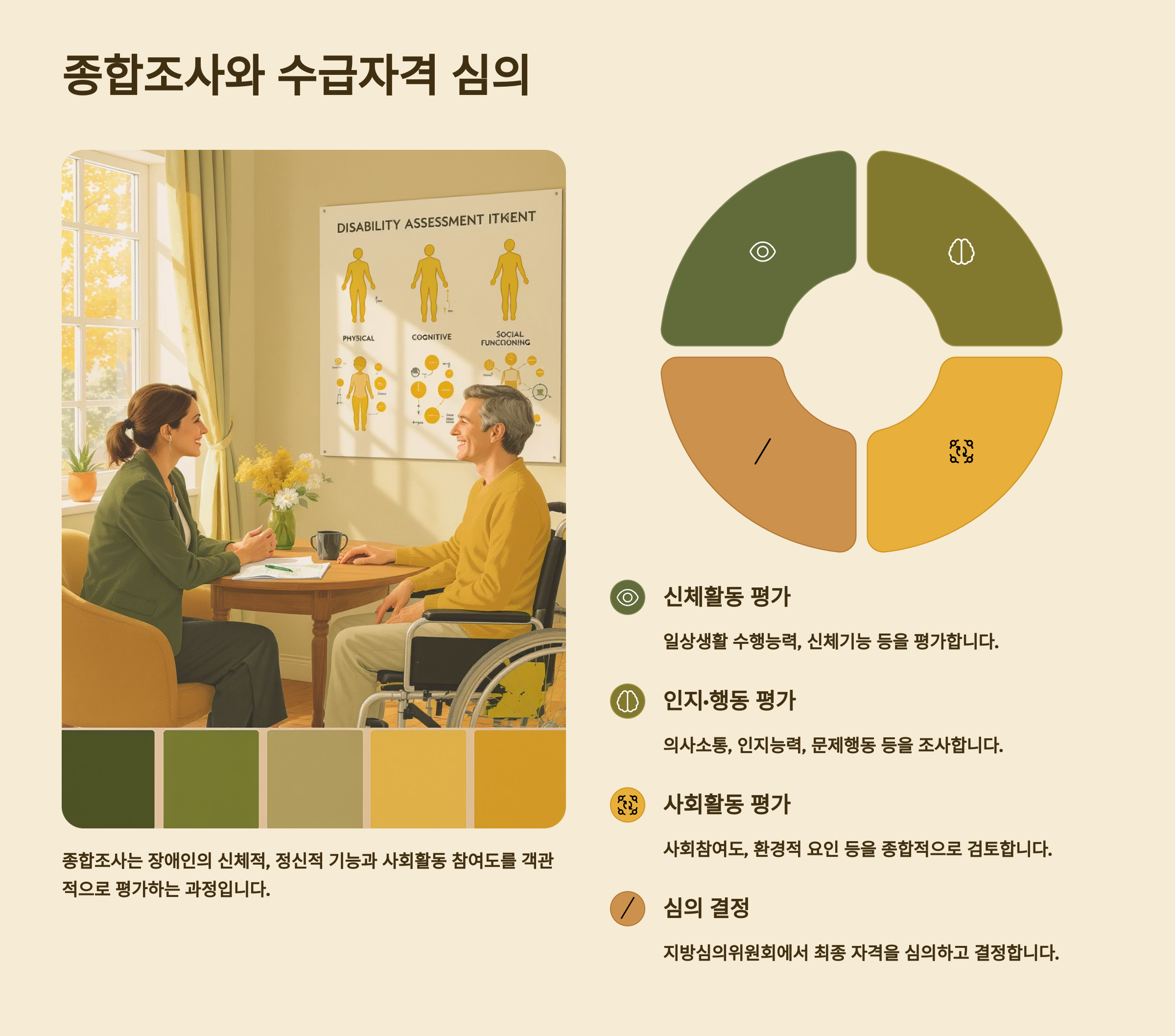 종합조사는 약 1시간 정도 걸려요. 조사원이 일상생활 수행능력, 인지능력, 행동특성 등을 평가하게 되는데, 너무 긴장하지 마세요! 평소 생활하는 모습 그대로 보여주시면 된답니다. 가족이나 보호자가 함께 참여해서 도움을 줄 수도 있어요.