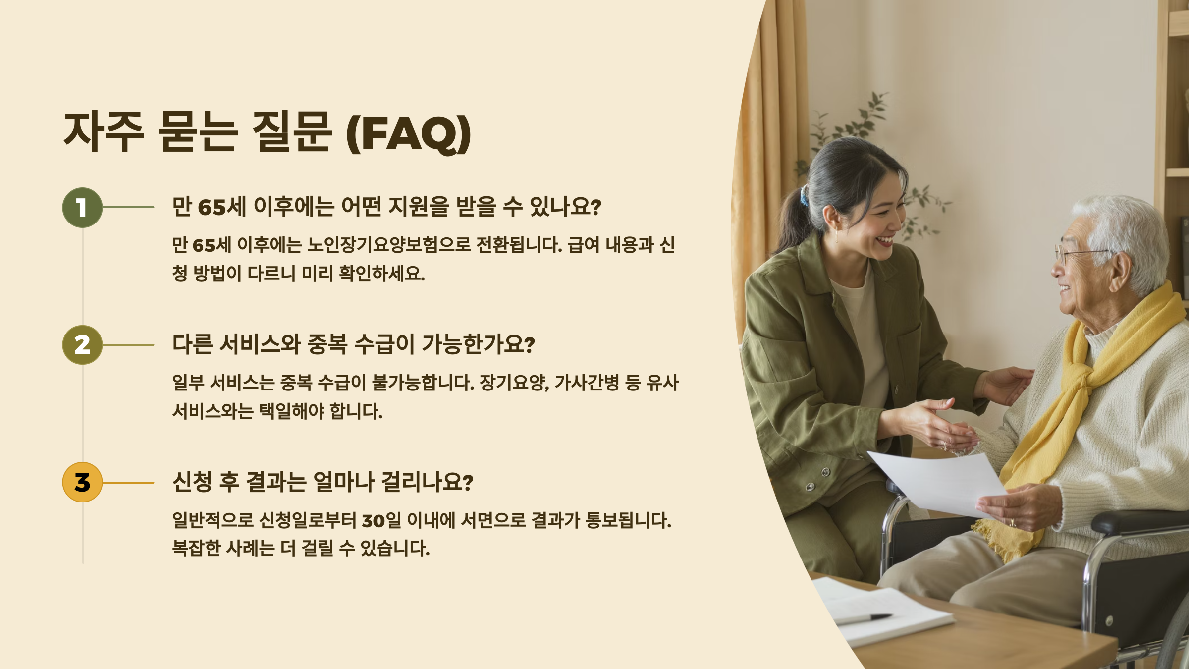 A1. 아니요, 동시에 받을 수는 없어요. 만 65세가 되면 노인장기요양보험으로 전환되는데, 활동지원 서비스를 계속 받고 싶다면 선택할 수 있답니다. 다만 이 경우 노인장기요양보험 신청은 포기해야 해요. 어떤 서비스가 더 유리한지는 개인 상황에 따라 다르니 상담을 받아보세요!