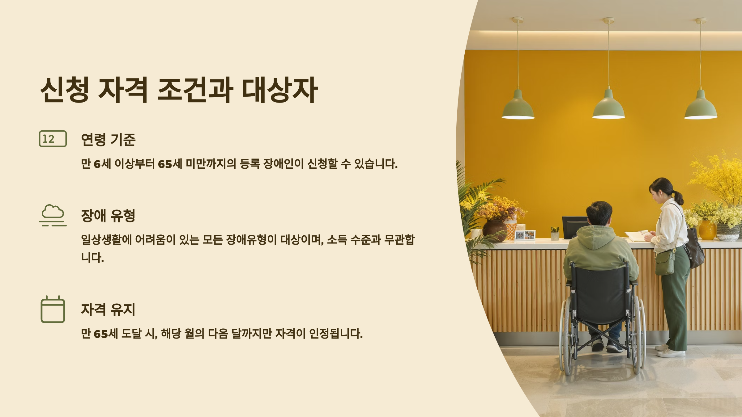 장애인 활동지원 서비스를 신청하려면 몇 가지 조건을 충족해야 해요. 가장 기본적인 조건은 만 6세 이상 65세 미만의 장애인복지법상 등록 장애인이어야 한답니다. 2025년부터는 발달장애인의 경우 만 6세 이전이라도 의사 소견서가 있으면 신청이 가능해졌어요!
