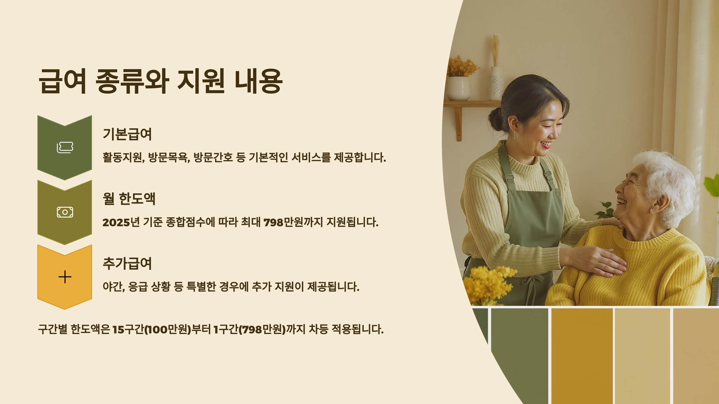 | 활동보조 | 신체활동, 가사활동, 사회활동 지원 | 월 47~480시간 |