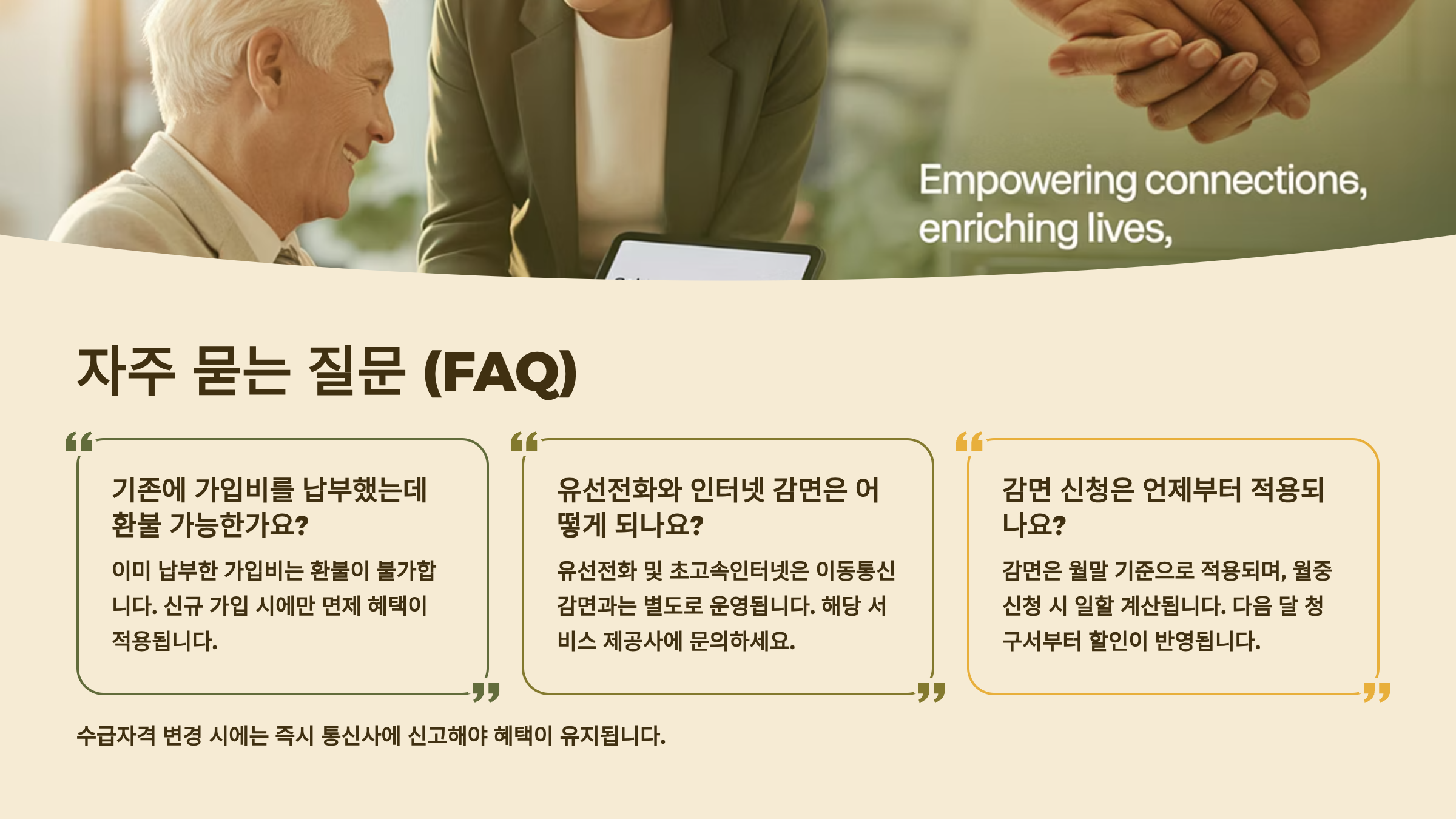 A3. 기초생활수급자는 월 최대 35,000원, 차상위계층·장애인·국가유공자는 월 최대 21,000원까지 지원받을 수 있어요. 여기에 통신사 자체 할인까지 더하면 월 통신비를 1~2만원으로 줄일 수 있답니다.