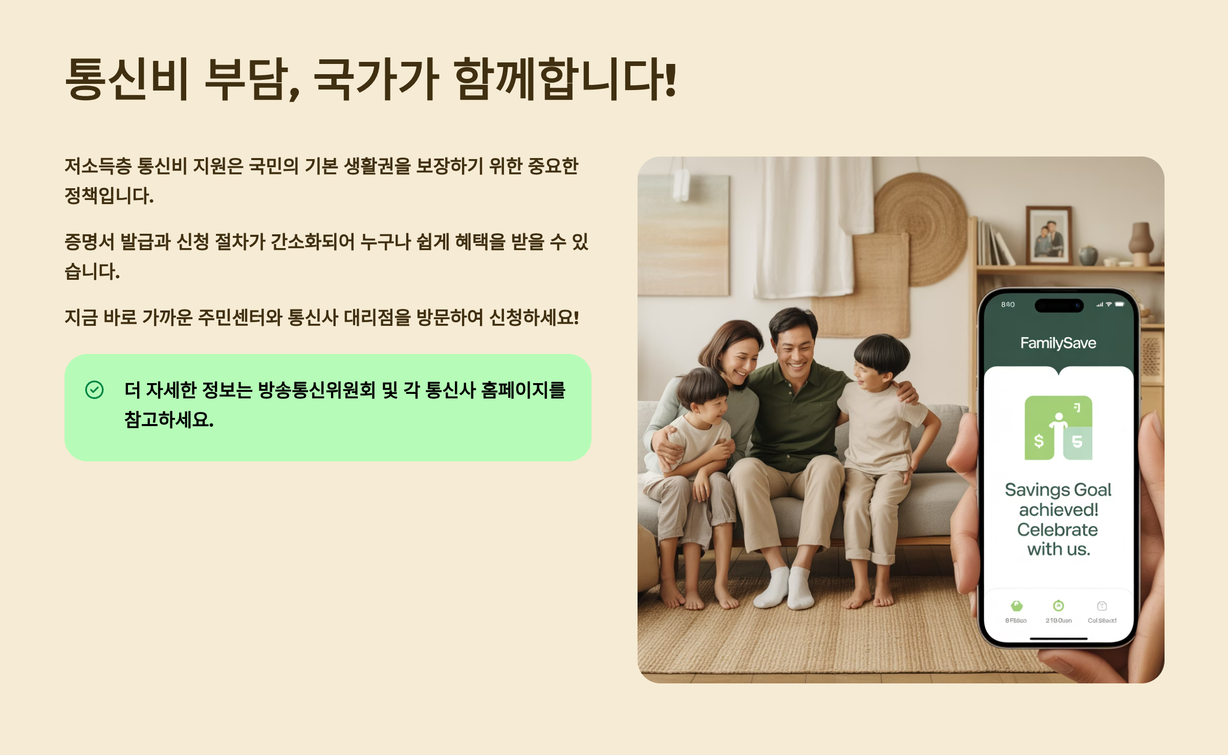 신청 자격이 되신다면 망설이지 말고 바로 신청하세요! 통신비는 매달 나가는 고정 지출이라 작은 금액이라도 할인받으면 1년이면 꽤 큰 금액이 됩니다. 특히 가족 구성원이 많을수록 절약 효과가 커지니까요. 정부가 마련한 좋은 제도인 만큼 적극적으로 활용하시길 바라요! 😊