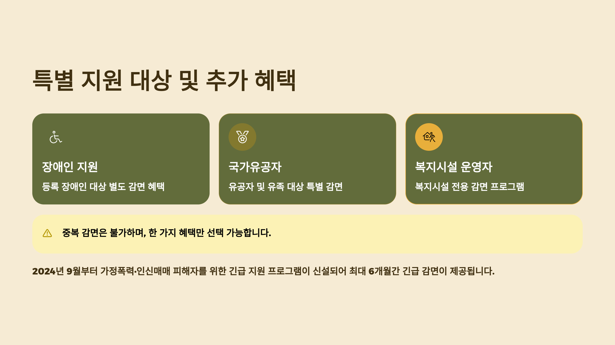 | 지원 항목 | 기초생활수급자 | 차상위/장애인/유공자 | 일반 요금 |