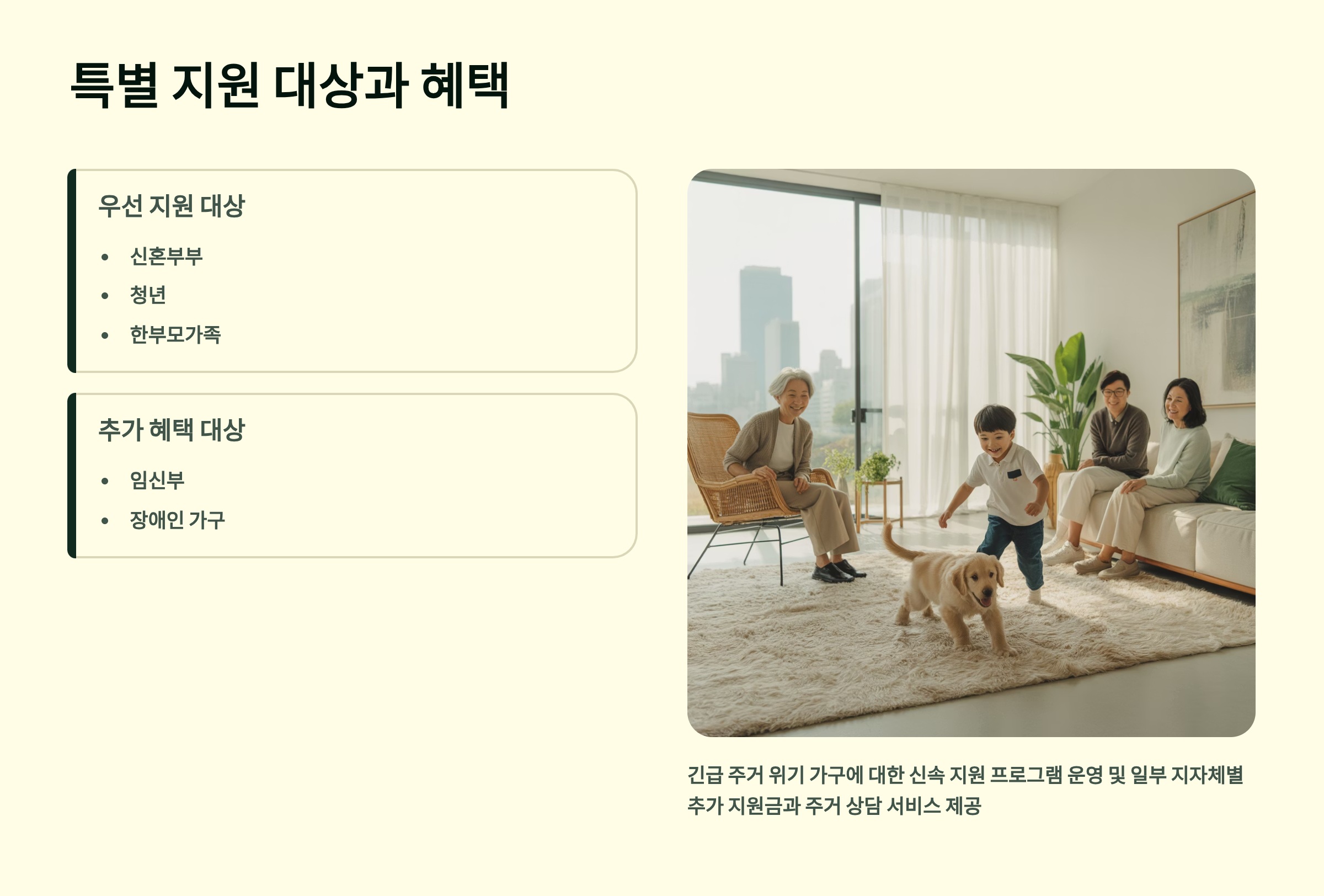 특별 우대 대상도 있어요! 한부모가족, 장애인 가구, 65세 이상 노인 가구는 소득 기준이 70%까지 완화돼요. 신혼부부는 혼인신고 후 7년 이내면 소득 기준 20% 추가 완화를 받을 수 있답니다. 다자녀 가구(2자녀 이상)도 10% 완화 혜택이 있어요. 기초생활수급자나 차상위계층은 별도 심사 없이 자동으로 지원 대상이 된답니다.