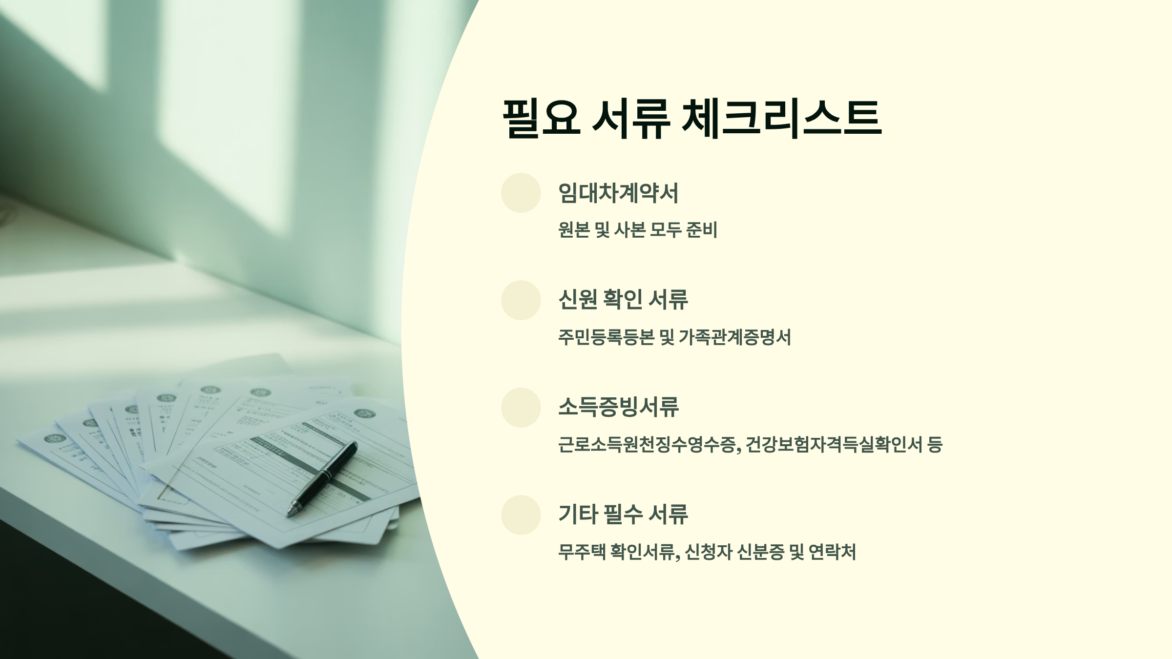 주거안정 월세지원 신청에 필요한 서류를 꼼꼼히 준비해야 해요! 기본서류는 신청서, 신분증 사본, 임대차계약서, 통장사본이에요. 소득증빙서류로는 근로소득원천징수영수증, 소득금액증명원, 사업자등록증 등이 필요해요. 재산 관련 서류는 등기사항전부증명서, 자동차등록증, 금융거래정보제공동의서가 있어요. 가구 특성에 따라 추가 서류가 필요할 수 있답니다.