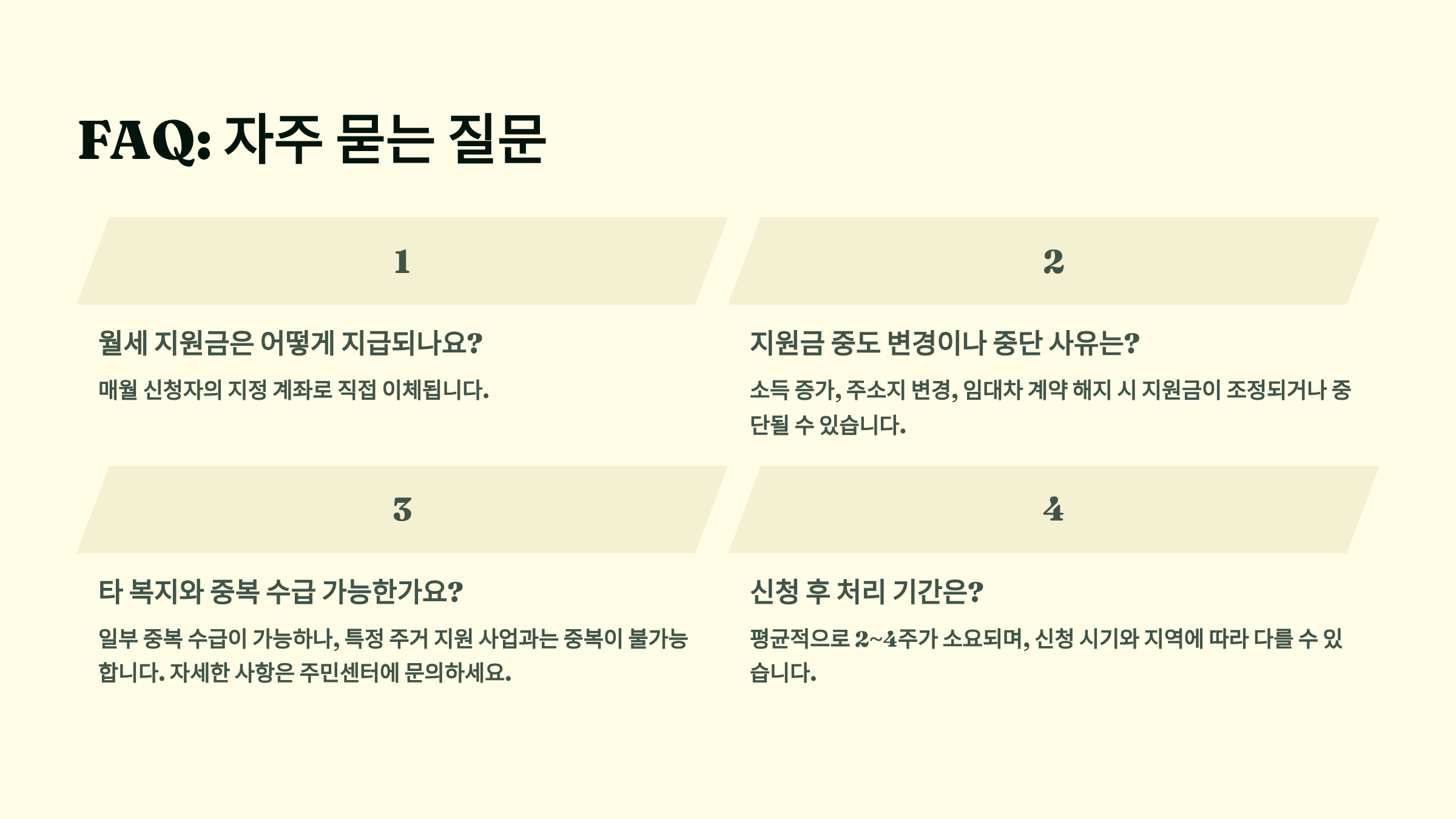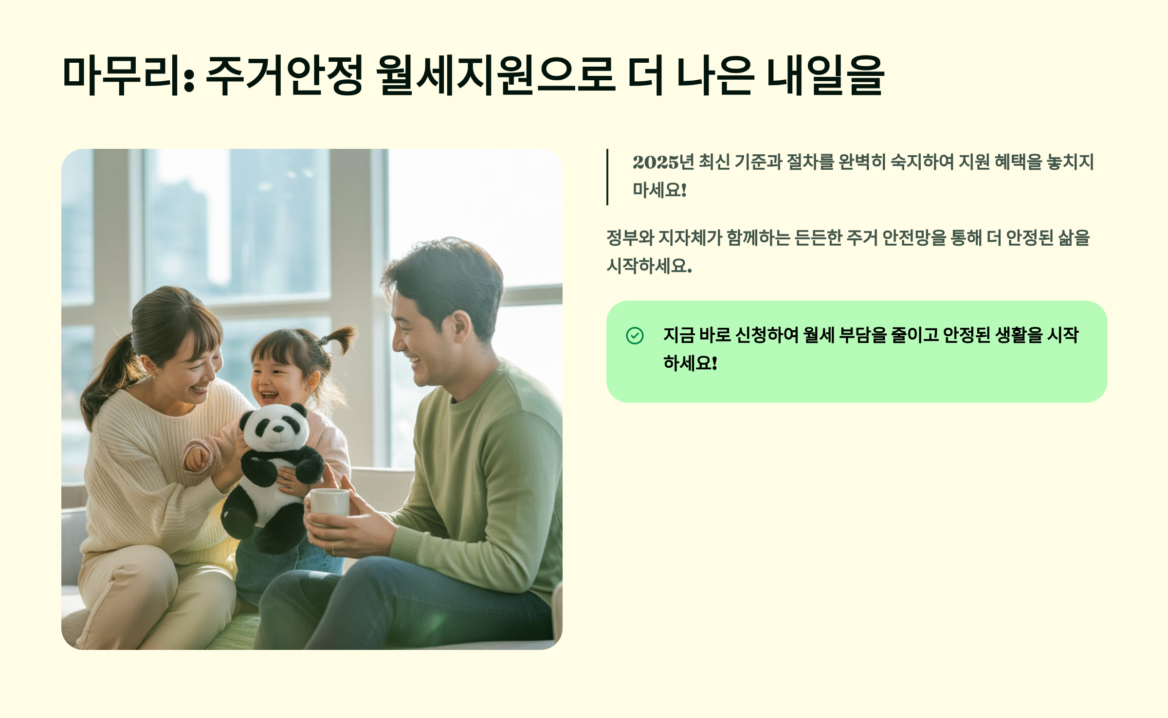 본 콘텐츠는 2025년 1월 기준 주거안정 월세지원 제도에 대한 일반적인 정보를 제공하기 위한 목적으로 작성되었습니다. 정책은 수시로 변경될 수 있으며, 개인별 상황에 따라 적용 기준이 다를 수 있습니다. 정확한 정보와 본인의 자격 여부는 반드시 마이홈포털(www.myhome.go.kr) 또는 관할 주민센터를 통해 확인하시기 바랍니다. 본 정보를 근거로 한 의사결정에 대한 책임은 이용자 본인에게 있음을 알려드립니다.