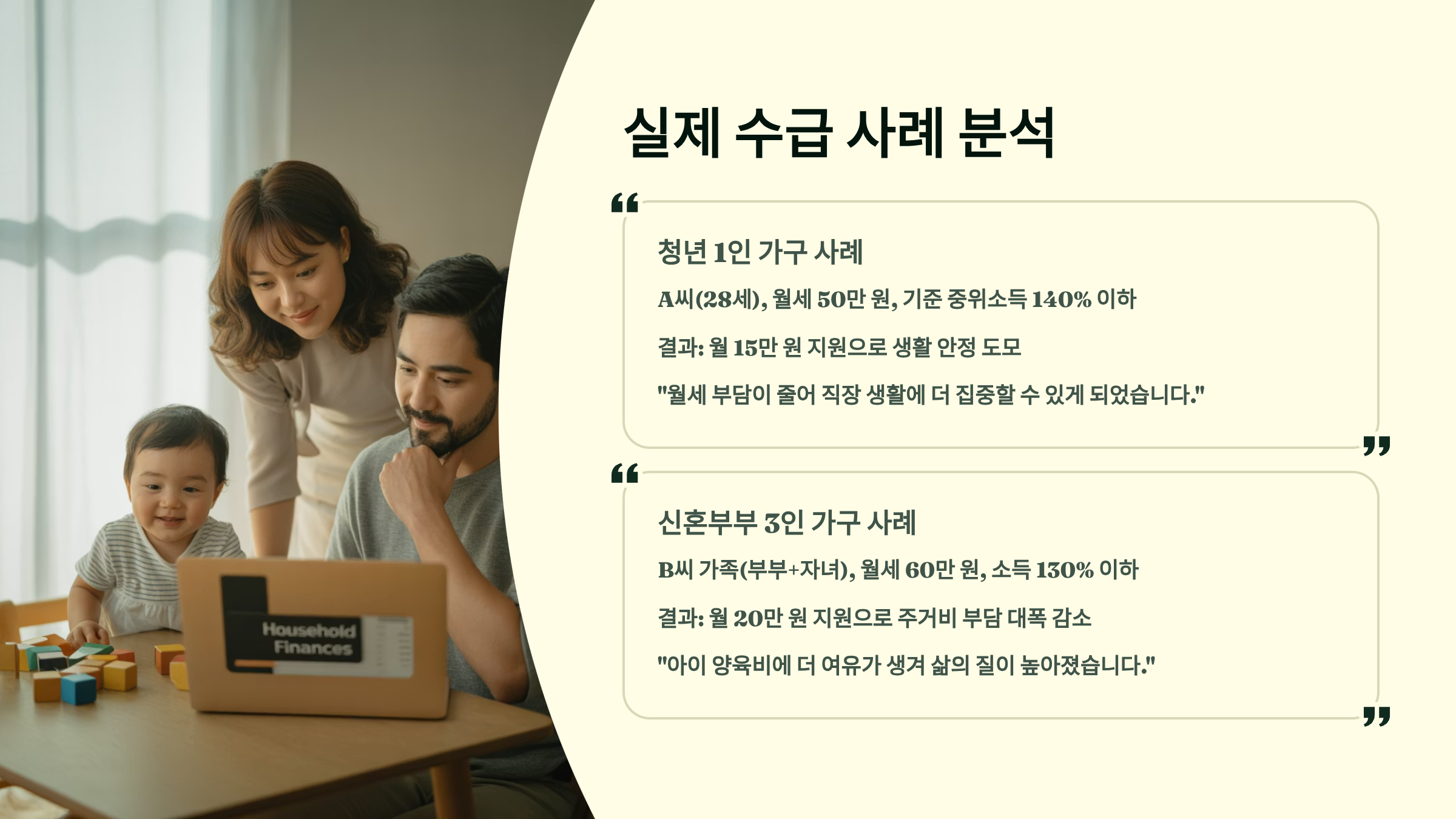 실제 수급 사례를 통해 구체적으로 알아볼게요! A씨(28세, 서울 거주)는 월 소득 120만원의 1인 가구예요. 월세 45만원 원룸에 거주하며 보증금은 500만원이에요. 청년 월세지원을 신청해서 월 20만원을 지원받고 있어요. 실제 부담 월세가 25만원으로 줄어들어 생활이 한결 나아졌답니다. 저축도 가능해져서 전세 자금을 모으고 있어요.