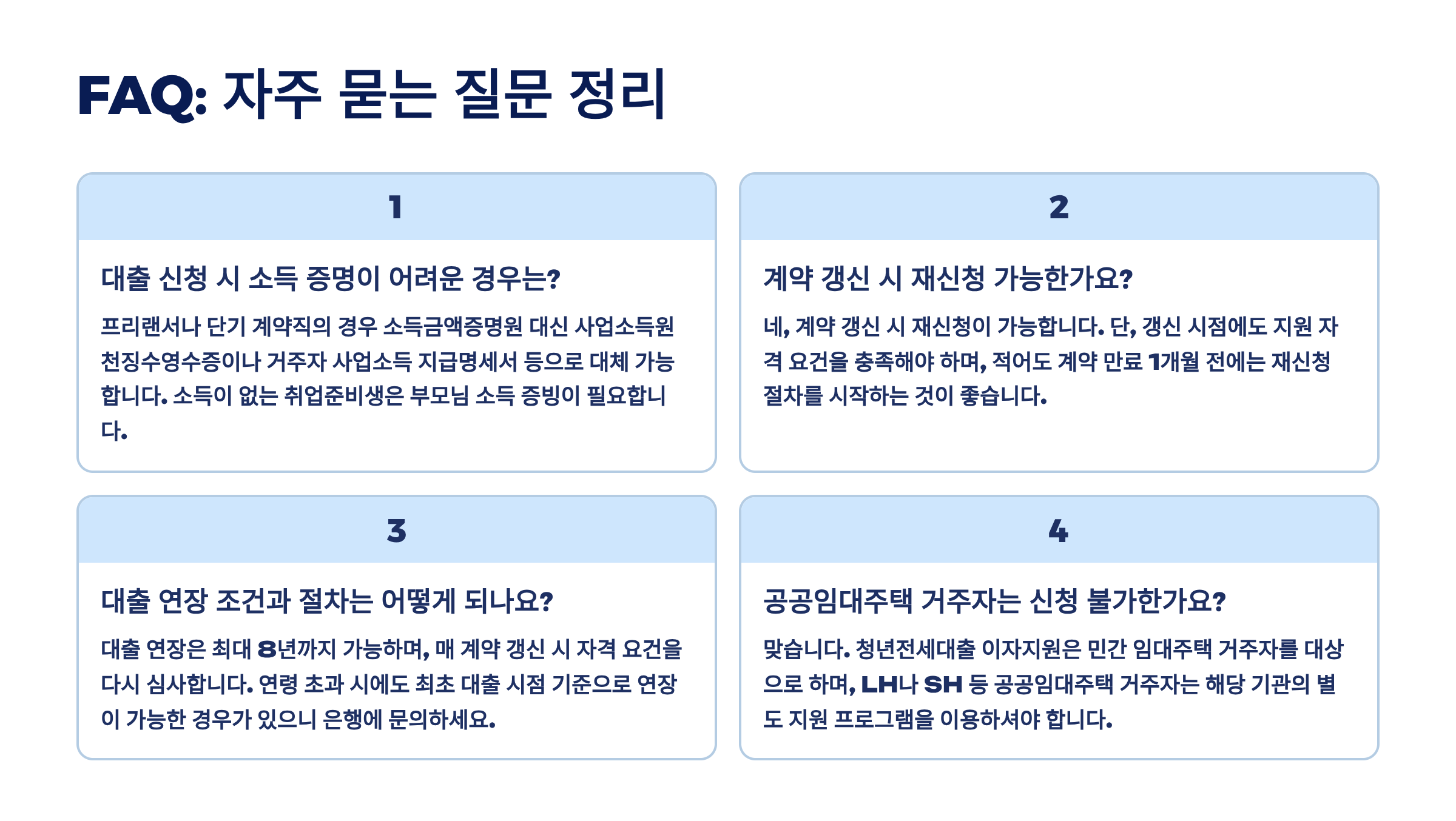 A7. 새로운 전세 계약을 체결하면 계속 지원받을 수 있어요! 다만 이사 후 1개월 이내에 변경 신고를 해야 하고, 자격 요건을 다시 심사받아요.