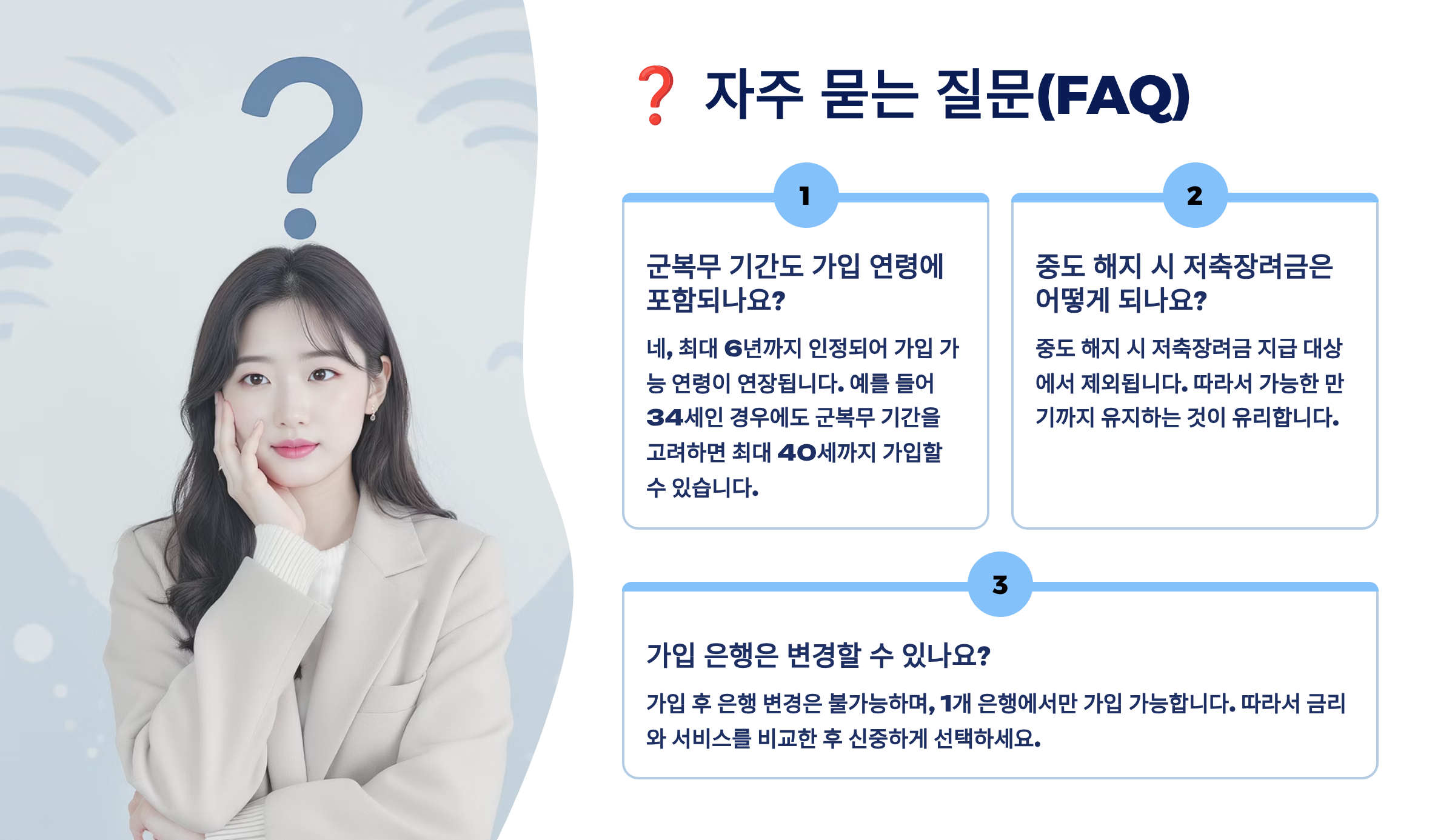 A1. 가입일 기준 만 19세~34세예요. 1990년 1월 1일~2006년 12월 31일 출생자가 해당됩니다. 군 복무자는 복무 기간만큼 연장되어 최대 만 40세까지 가능해요.