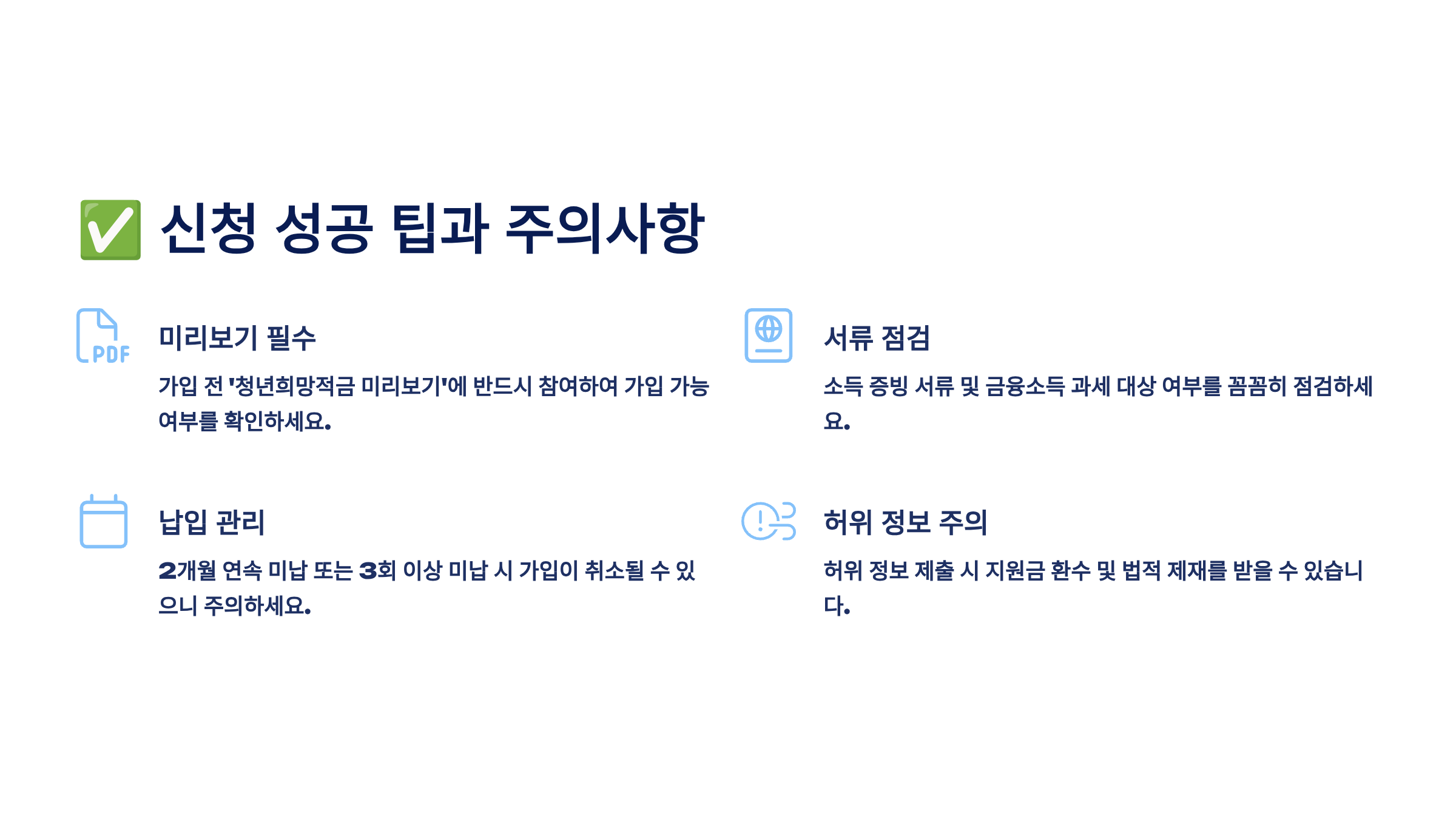 마지막 팁! 신청 시기도 중요해요. 월초에 가입하면 그달부터 바로 납입을 시작할 수 있지만, 월말에 가입하면 다음 달부터 시작하는 게 나을 수 있어요. 본인의 자금 계획에 맞춰 신청 시기를 조절하면 좋답니다! 📅