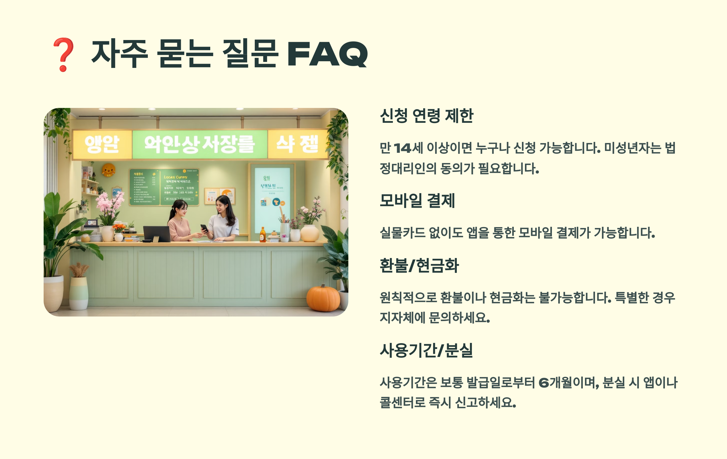 A6. 모바일 앱이나 웹사이트를 통해 언제든지 사용 내역을 확인할 수 있어요. 카드형의 경우에도 전용 앱을 다운로드하면 실시간으로 잔액과 사용 내역을 볼 수 있답니다. 월별, 분기별 사용 통계도 제공해서 가계 관리에도 도움이 돼요.