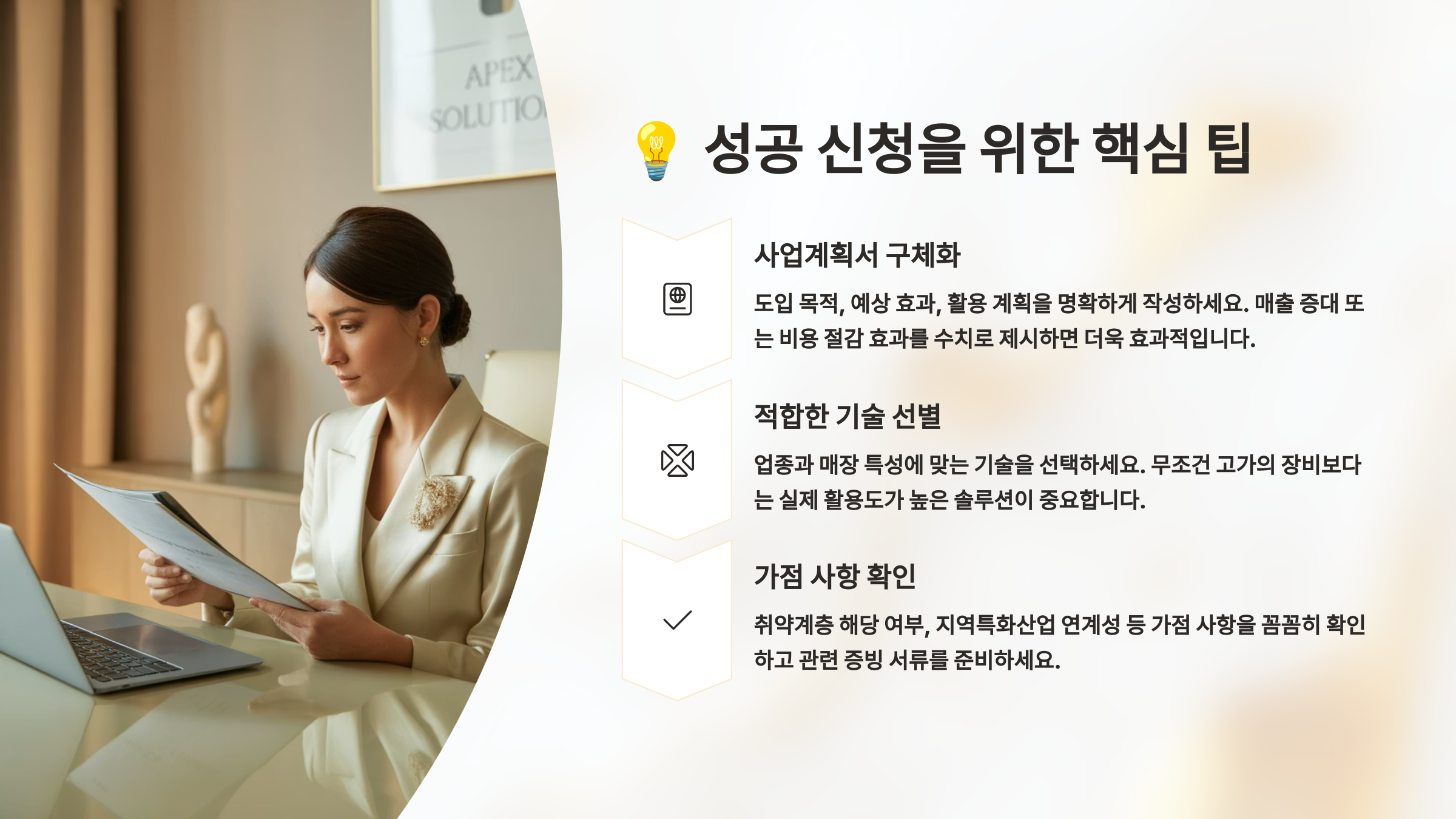 지원 금액을 최대한 활용하려면 여러 기술을 조합해서 신청하는 것도 좋은 방법이에요. 500만원 한도 내에서 다양한 솔루션을 도입할 수 있거든요! 💡
