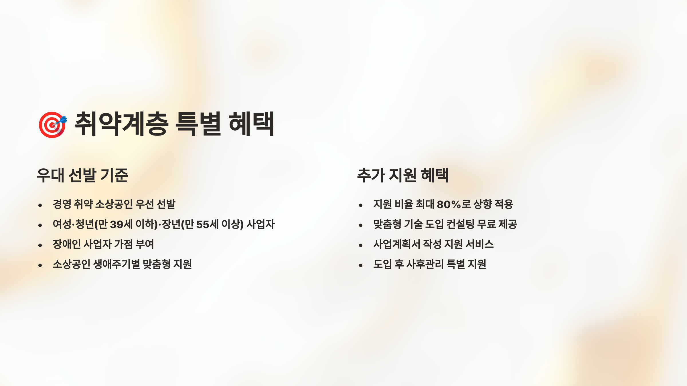 취약계층은 스마트상점 바우처 사업에서 정말 파격적인 혜택을 받을 수 있어요. 올해부터 지원율이 대폭 상향되어 최대 100%까지 국비 지원을 받을 수 있게 되었거든요. 이는 정부가 소상공인 중에서도 특히 어려운 상황에 있는 분들을 더욱 적극적으로 돕겠다는 의지를 보여주는 거예요.