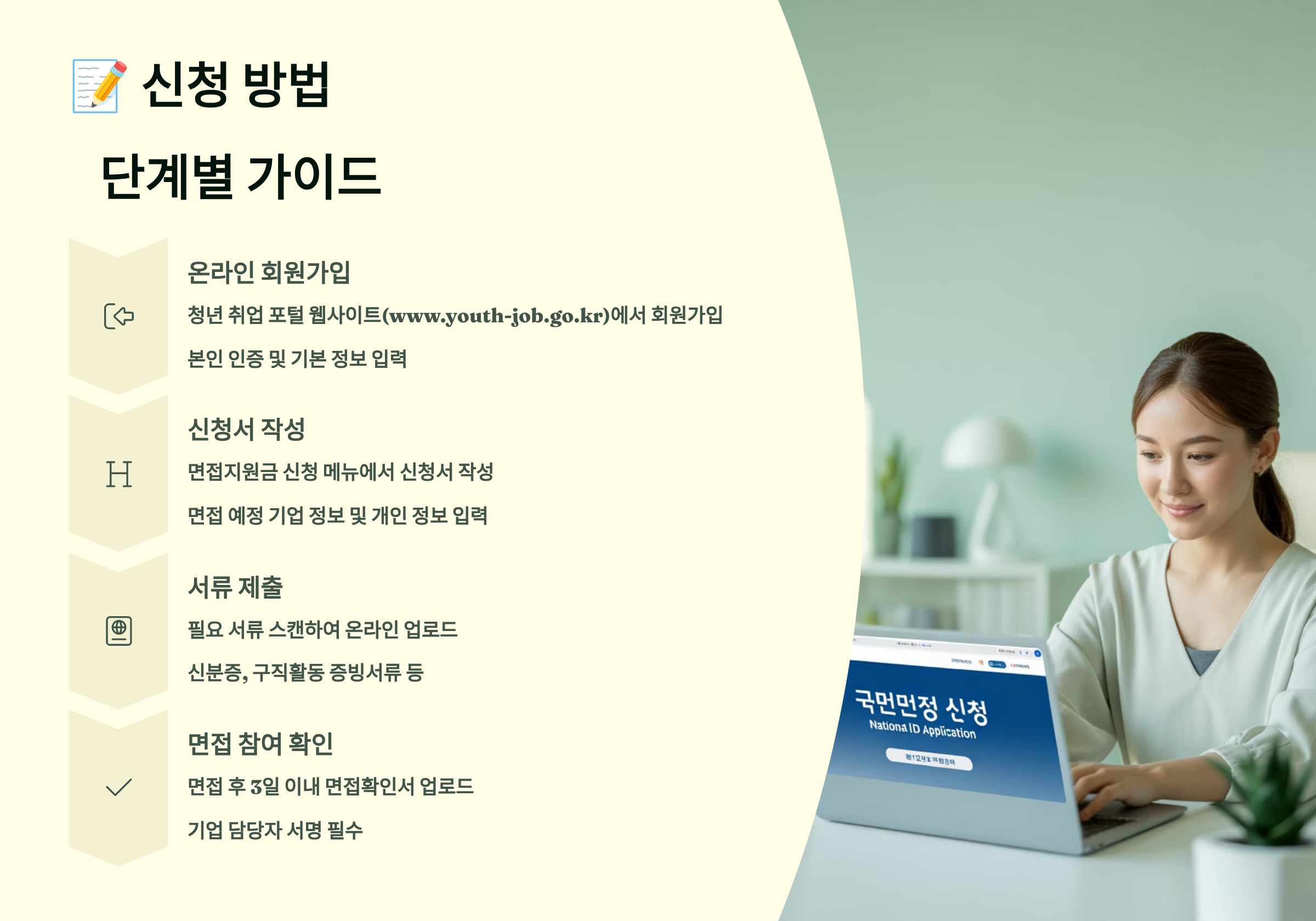 신청 시기도 중요해요! 면접일 기준 14일 전부터 면접 후 14일 이내에 신청해야 해요. 너무 일찍 신청하거나 너무 늦게 신청하면 반려될 수 있으니 주의하세요. 가장 좋은 시기는 면접 3~7일 전이에요. 미리 지원금을 받아서 여유롭게 준비할 수 있거든요!