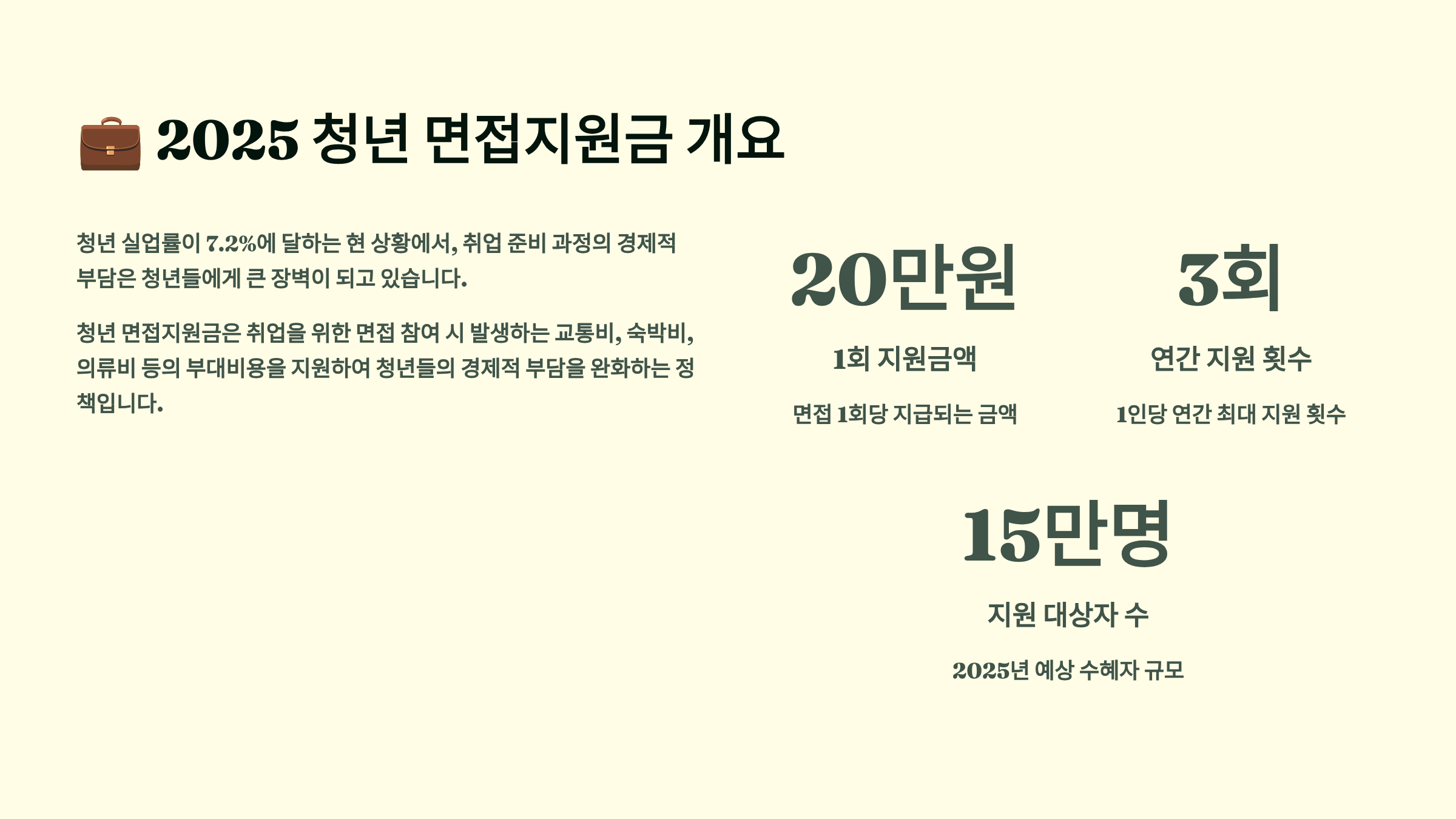 청년 면접지원금은 취업 준비 중인 청년들의 면접 활동에 소요되는 경제적 부담을 줄이기 위해 정부에서 지원하는 제도예요! 💸 2025년부터는 더 많은 청년들이 혜택을 받을 수 있도록 지원 규모가 대폭 확대되었답니다. 단순히 교통비뿐만 아니라 숙박비, 식비까지 포함해서 실질적인 도움을 드리고 있어요.
