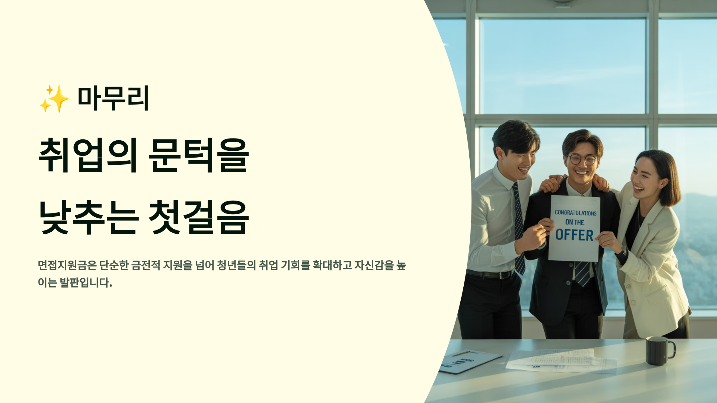 면접지원금은 단순한 경제적 지원을 넘어서 청년들에게 '기회의 평등'을 제공하는 제도예요. 경제적 여건 때문에 면접 기회를 포기하는 일이 없도록, 모든 청년이 공정하게 취업 기회를 가질 수 있도록 돕는 것이 목표랍니다. 특히 지방 거주 청년들이나 경제적으로 어려운 청년들에게는 더욱 의미 있는 지원이 되고 있어요.