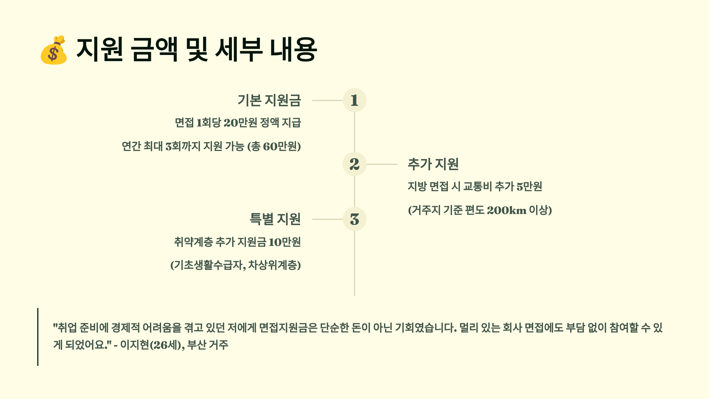 2025년 청년 면접지원금은 면접 1회당 최대 20만원까지 지원돼요! 💸 이는 전년도보다 5만원이나 인상된 금액이에요. 지원금은 교통비, 숙박비, 식비 등 면접과 관련된 모든 비용에 사용할 수 있답니다. 실비 정산이 아닌 정액 지원이라 영수증을 일일이 모을 필요가 없어서 편리해요!